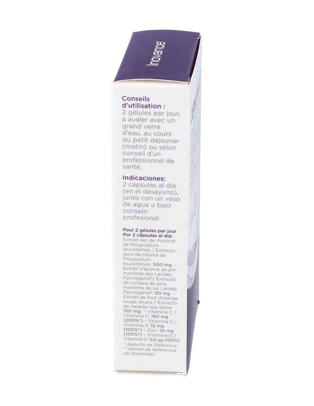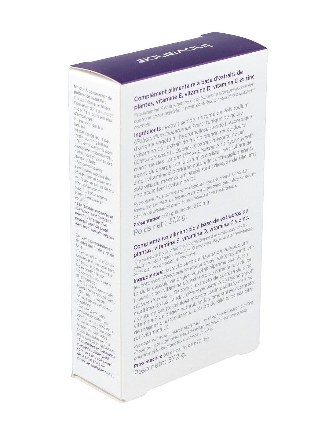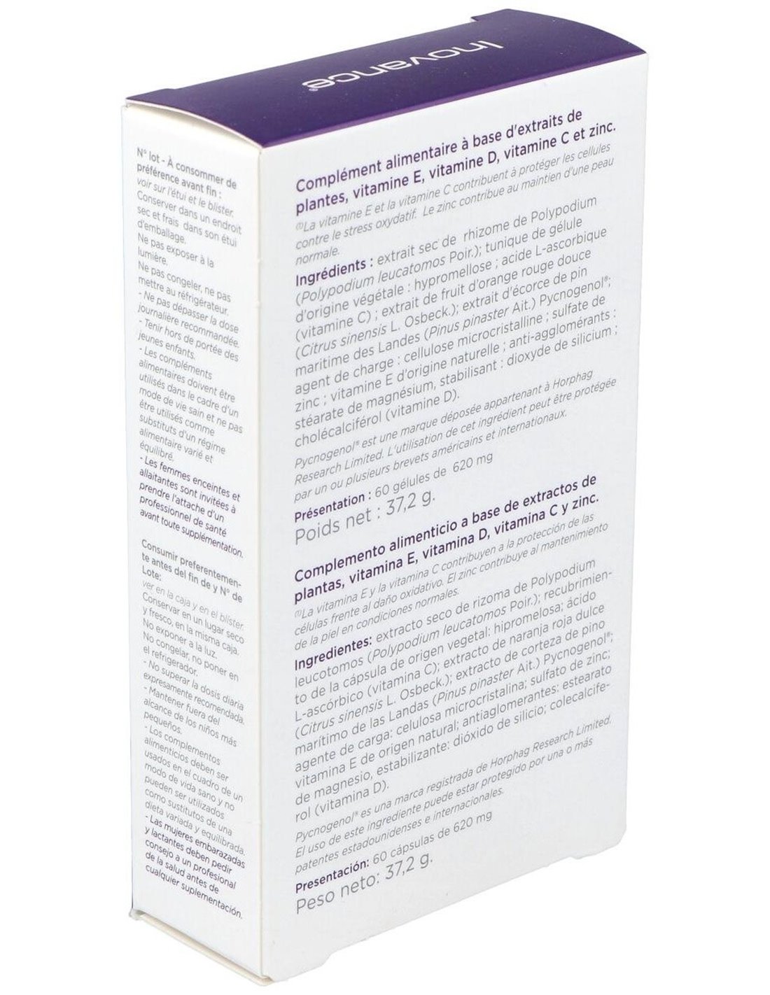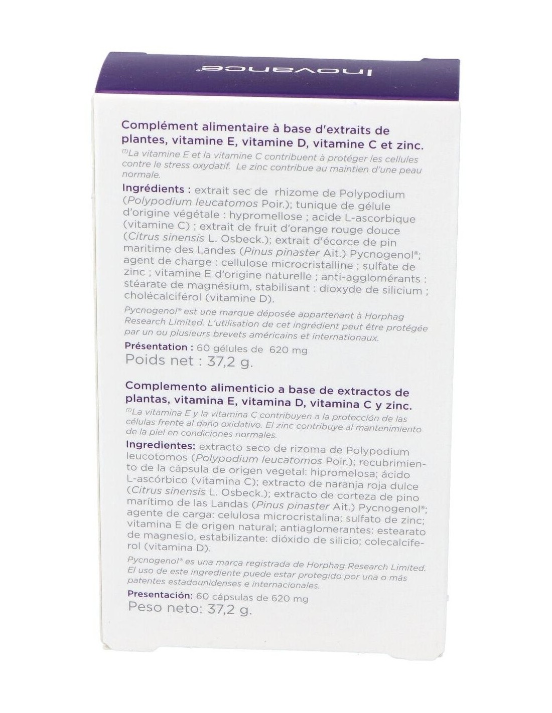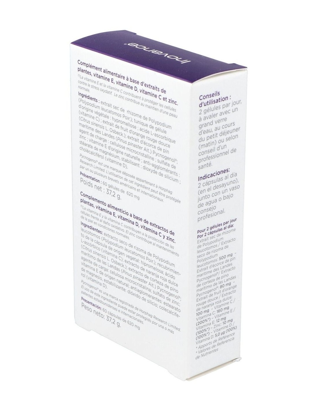 Extracto seco de rizoma de Polypodium (Polypodium leucotomos Por.); recubrimiento de la cápsula de origen vegetal: hipromelosa; ácido L-ascórbico (vitamina C); extracto de fruto de naranja roja dulce (Citrus sinensis L. Osbeck.); extracto de corteza de pino rodeno de la región francesa de Gascuña. (Pinus pinaster Ait.) Pycnogenol®; agente de carga: celulosa microcristalina; sulfato de zinc; vitamina E de origen natural; antiaglomerantes: estearato de magnesio, estabilizantes: dióxido de silicio; colecalciferol (vitamina D).