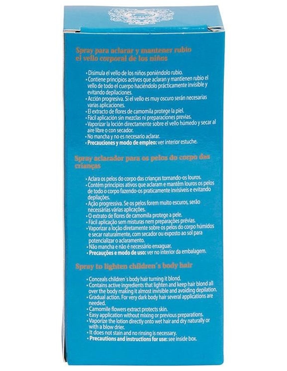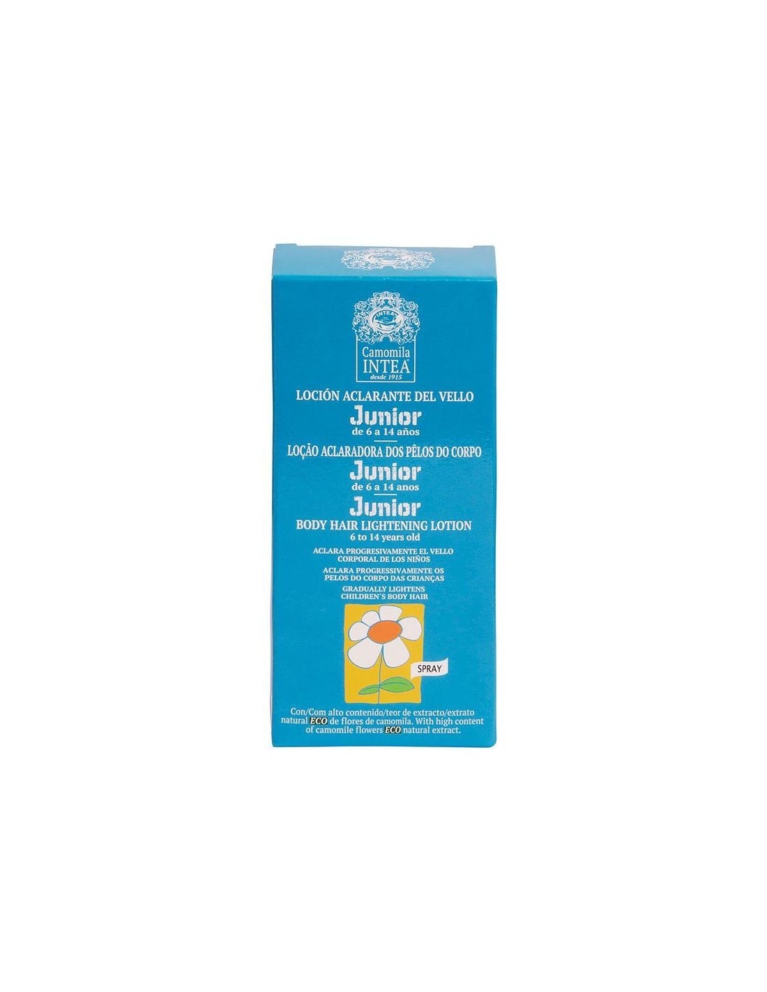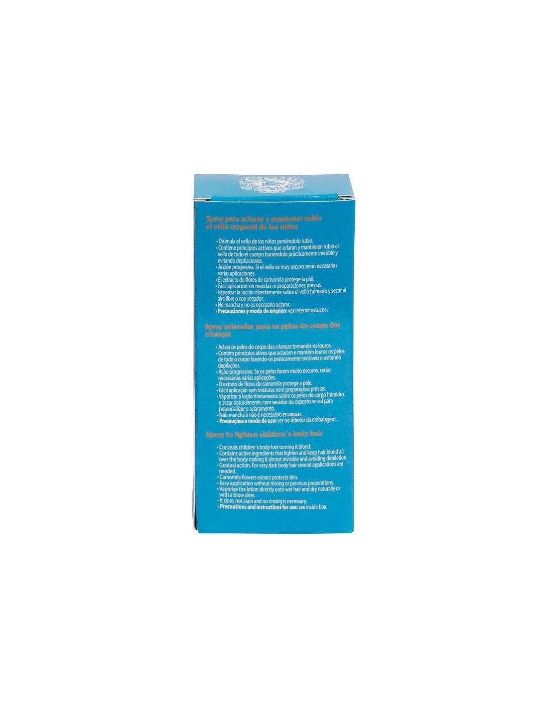 INTEAProducto desarrollado específicamente para decolorar el vello de brazos, piernas y cuerpo de los niños entre aproximadamente 6 y 14 años haciéndolo casi invisible. Su acción es suave y progresiva. Contiene principios activos extraídos de las flores de manzanilla que aclaran y protegen la piel. No contiene amoniaco ni tintes químicos. Aplicación directa con spray sin mezclas. Acción suave. Fórmula desarrollada y comprobada por farmacéuticos. No mancha. No contiene siliconas ni parabenos. No testado en animales.