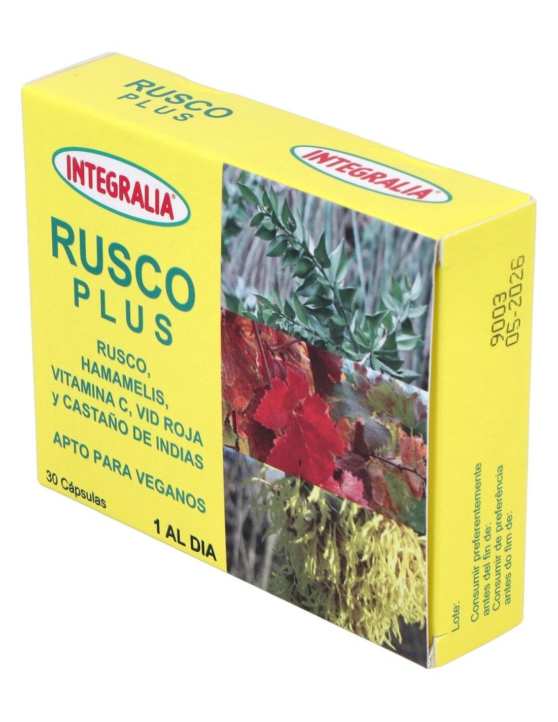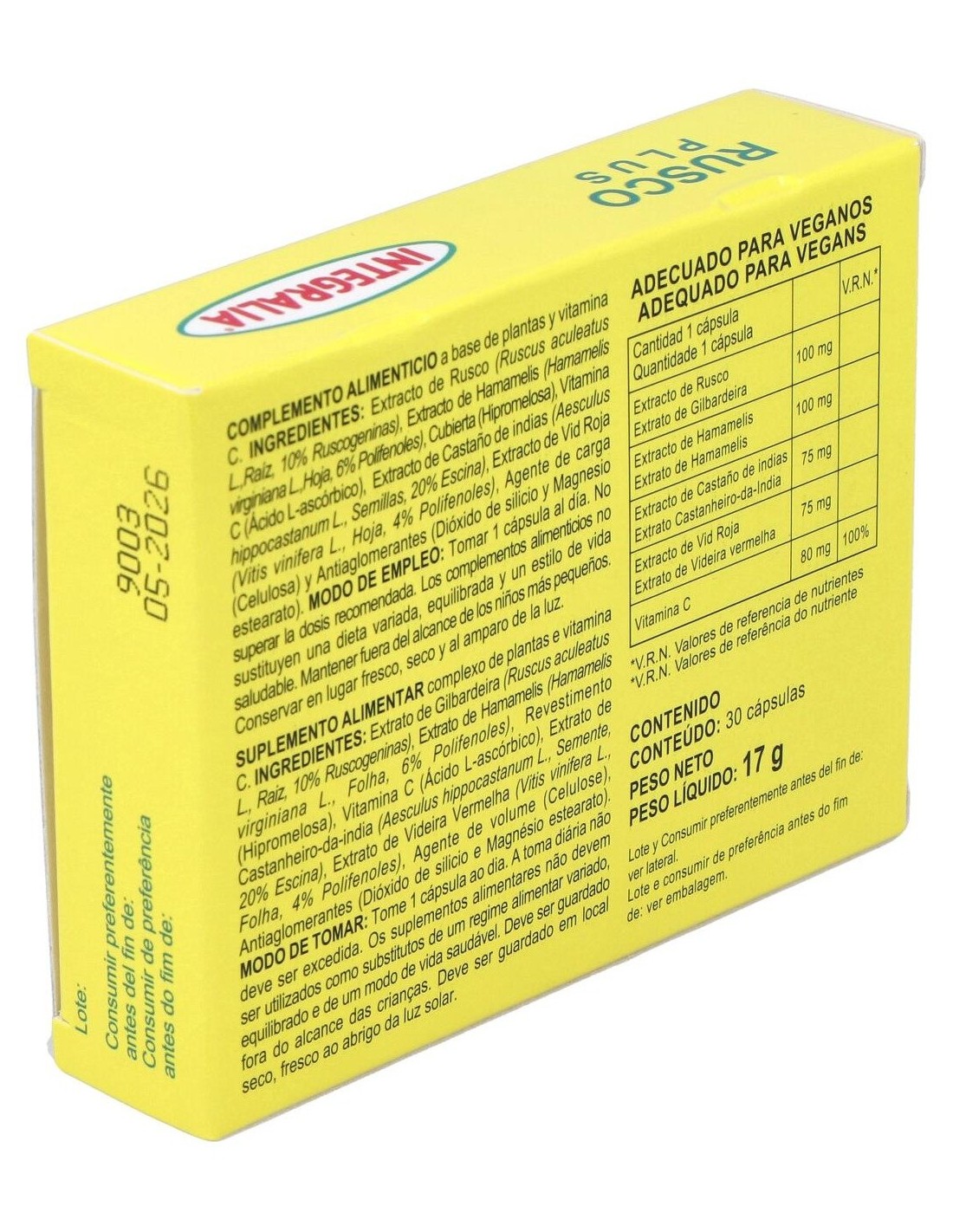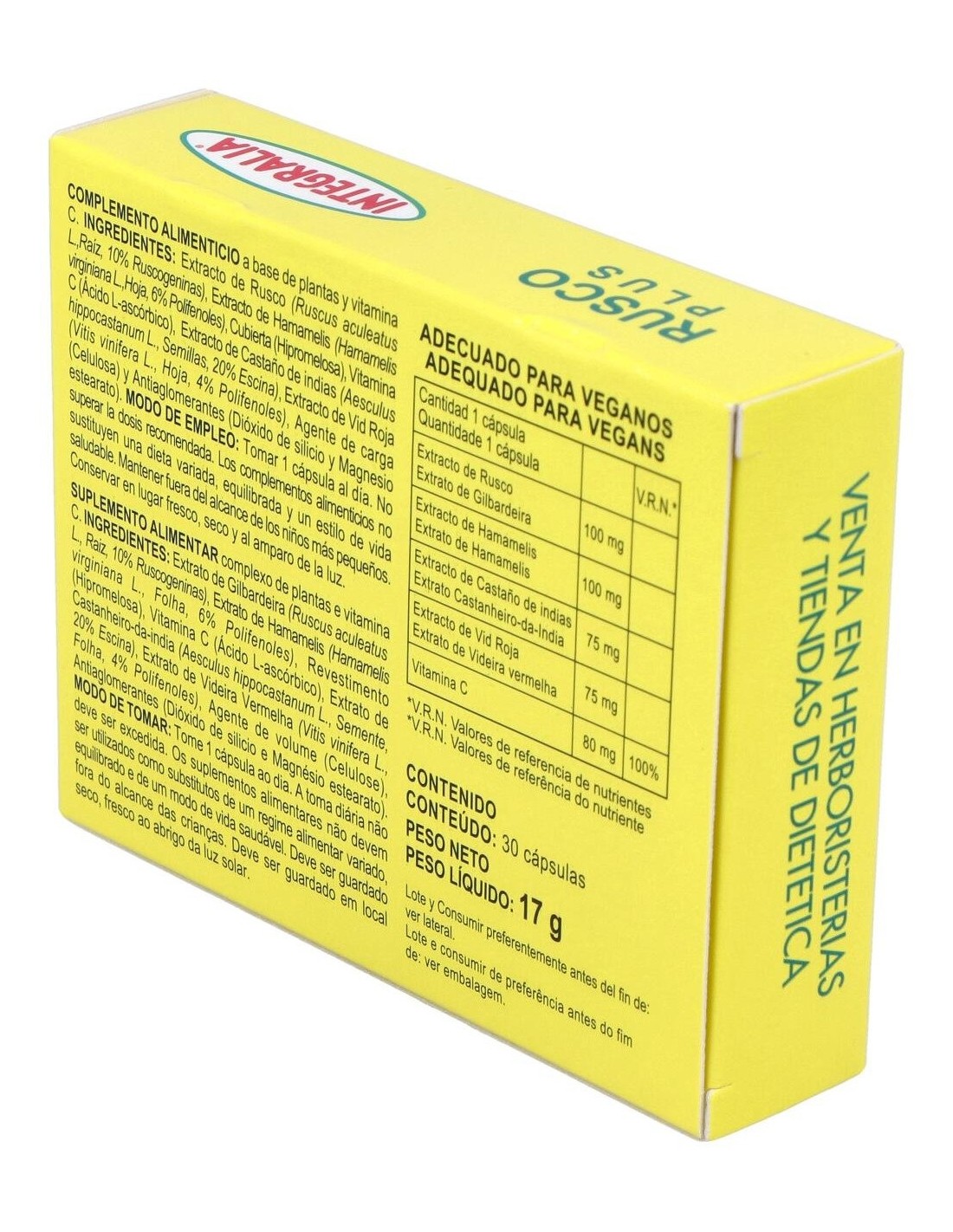 Por 1 cápsula: Extracto de rusco (Ruscus aculeatus L.,Raíz)(100 mg)(10% ruscogeninas), Extracto de hamamelis (Hamamelis virginiana L.,Hoja)(100 mg)(6% polifenoles), Extracto de vid Roja (Vitis vinifera L., Hoja)(70 mg)(4% polifenoles), Extracto de castaño de indias (Aesculus hippocastanum L., Semillas)(80 mg)(20% escina), Vitamina C (80 mg).
