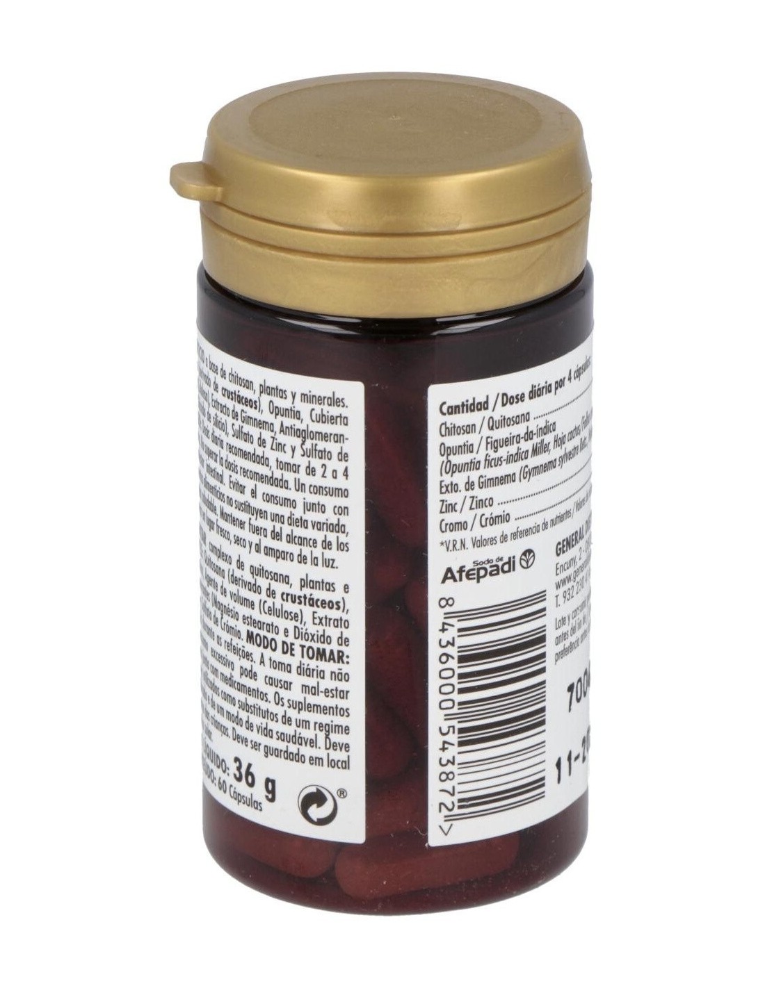 Chitosan (derivado de crustáceos), Opuntia, Cubierta (Gelatina), Agente de Carga (Celulosa), Extracto de Gymnema, Antiaglomerantes (Estearato de Magnesio, Dióxido de Silicio), Sulfato de Zinc y Sulfato de Cromo.