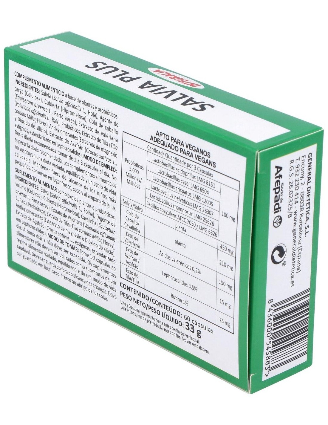 Salvia (Salvia officinalis L., Hoja) 450 mg, Cola de Caballo (Equisetum arvense L., Parte aérea) 210 mg, Ext. Valeriana (Valeriana officinalis L., Raíz) (Ácidos valerénicos 0,2%) 150 mg, Probióticos 5.000 Millones 100 mg, Lactobacillus acidophilus LMG 8151, Lactobacillus casei LMG 6904, Lactobacillus crispatus LMG 12005, Lactobacillus helveticus LMG 26307, Lactobacillus rhamnosus LMG 25626, Bacillus coagulans ATCC 7050 / LMG 6326, Ext. Tila (Tilia cordata Miller, Flor), (Rutina 1%) 75 mg., Ext. Azafrán (Crocus sativus L., estigmas),(Lepticrosalides 3,5%) 15 mg.