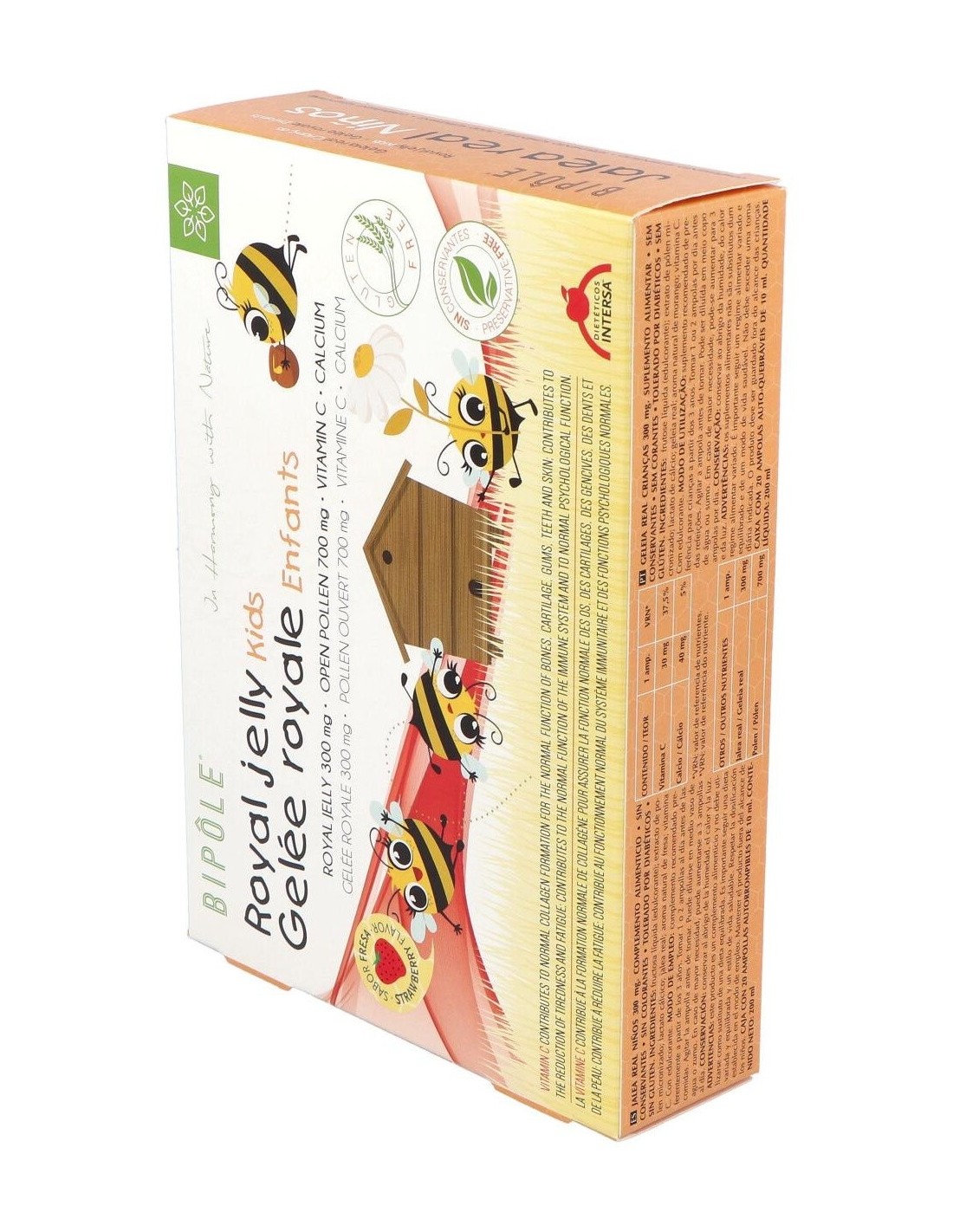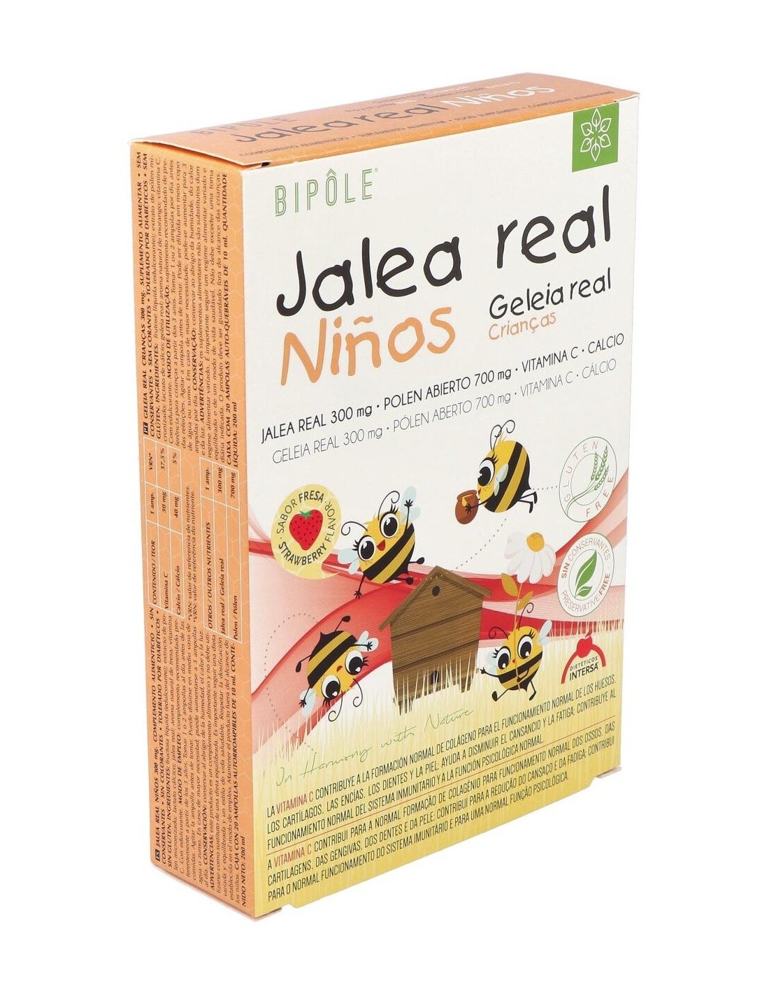 Suplemento infantil con nutrientes como jalea real y polen abierto. La vitamina C contribuye a disminuir el cansancio y la fatiga, al normal funcionamiento del sistema inmune y a la función psicológica normal. Ampollas con sabor a fresa.