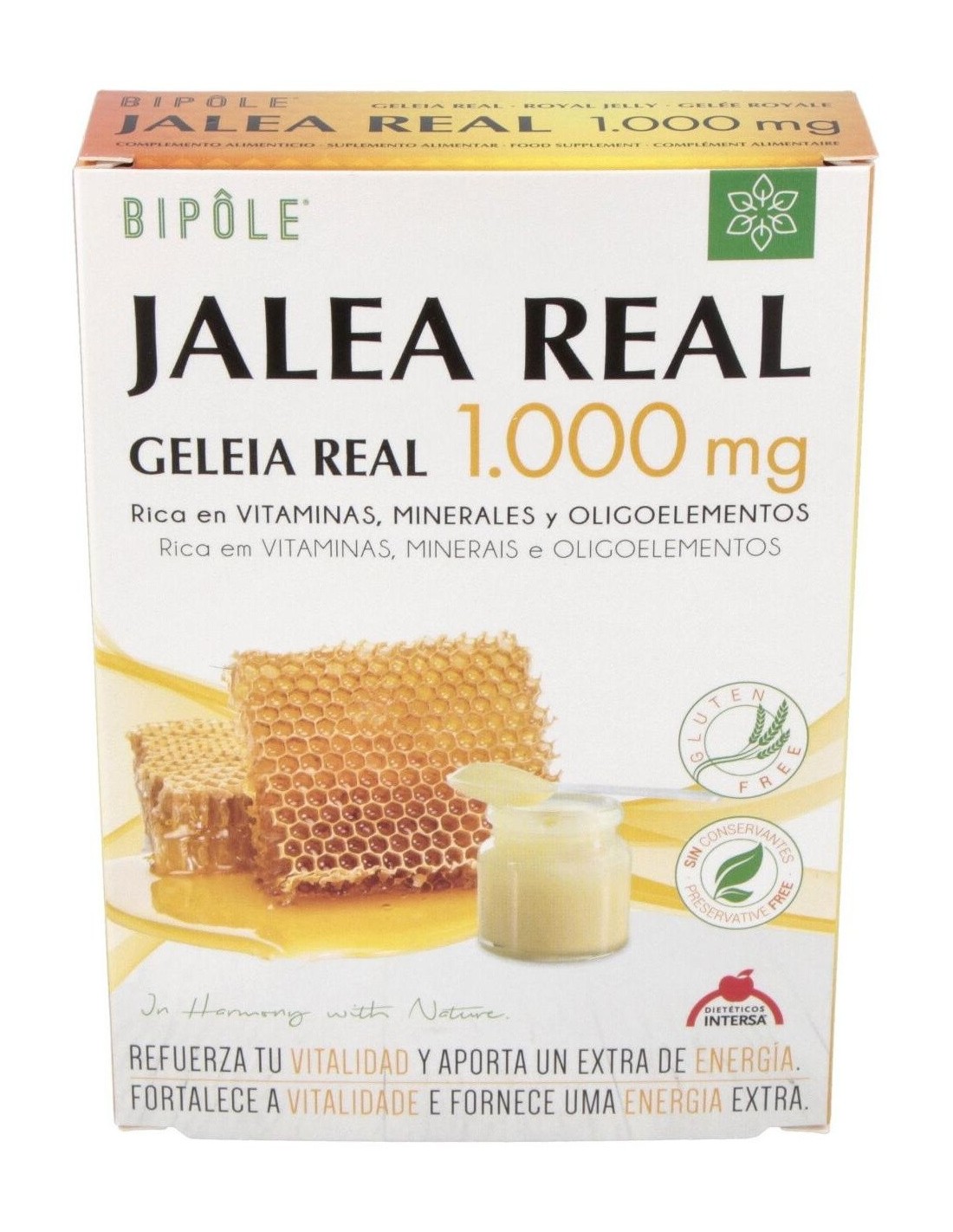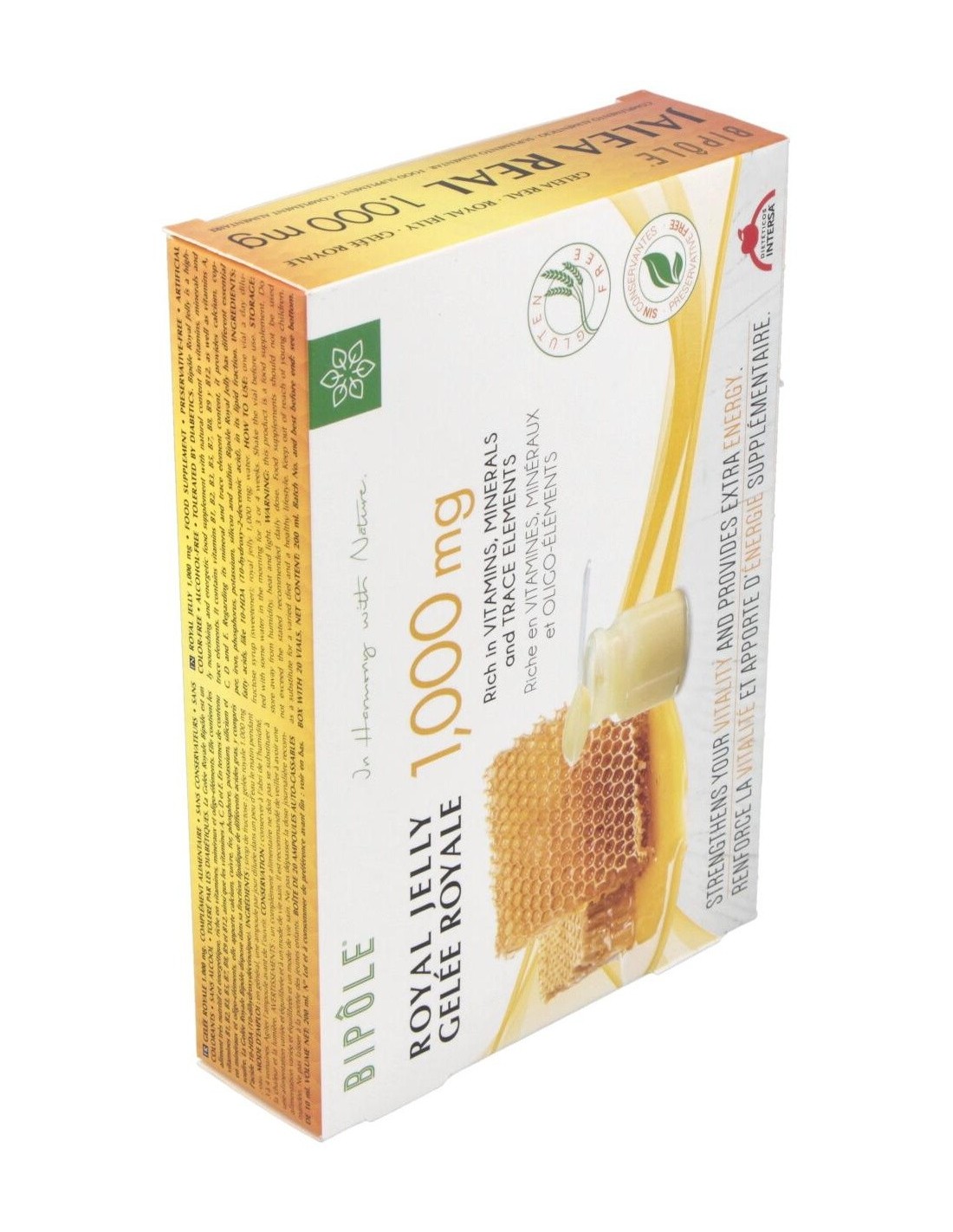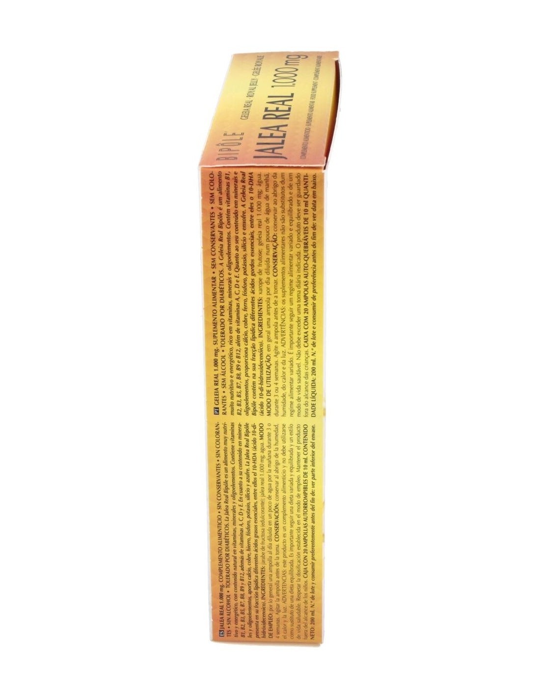 Complemento alimenticio a base de jalea real, sustancia rica en vitaminas, minerales y oligoelementos. Favorece el correcto desempeño físico y mental. A lajalea real se le atribuyen propiedades reconstituyentes y tonificantes. Caja de 20 ampollas de 10ml. Indicado para adultos.