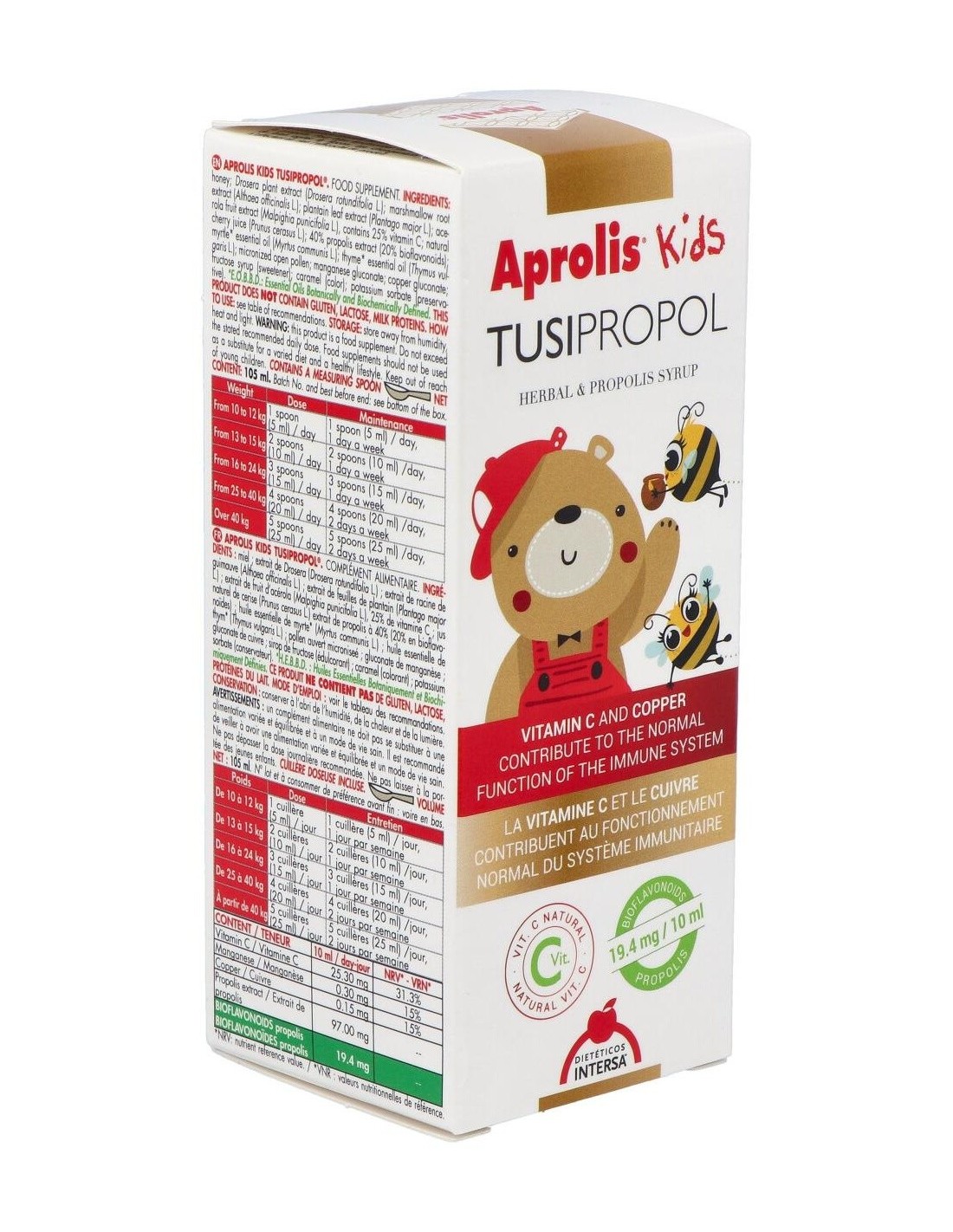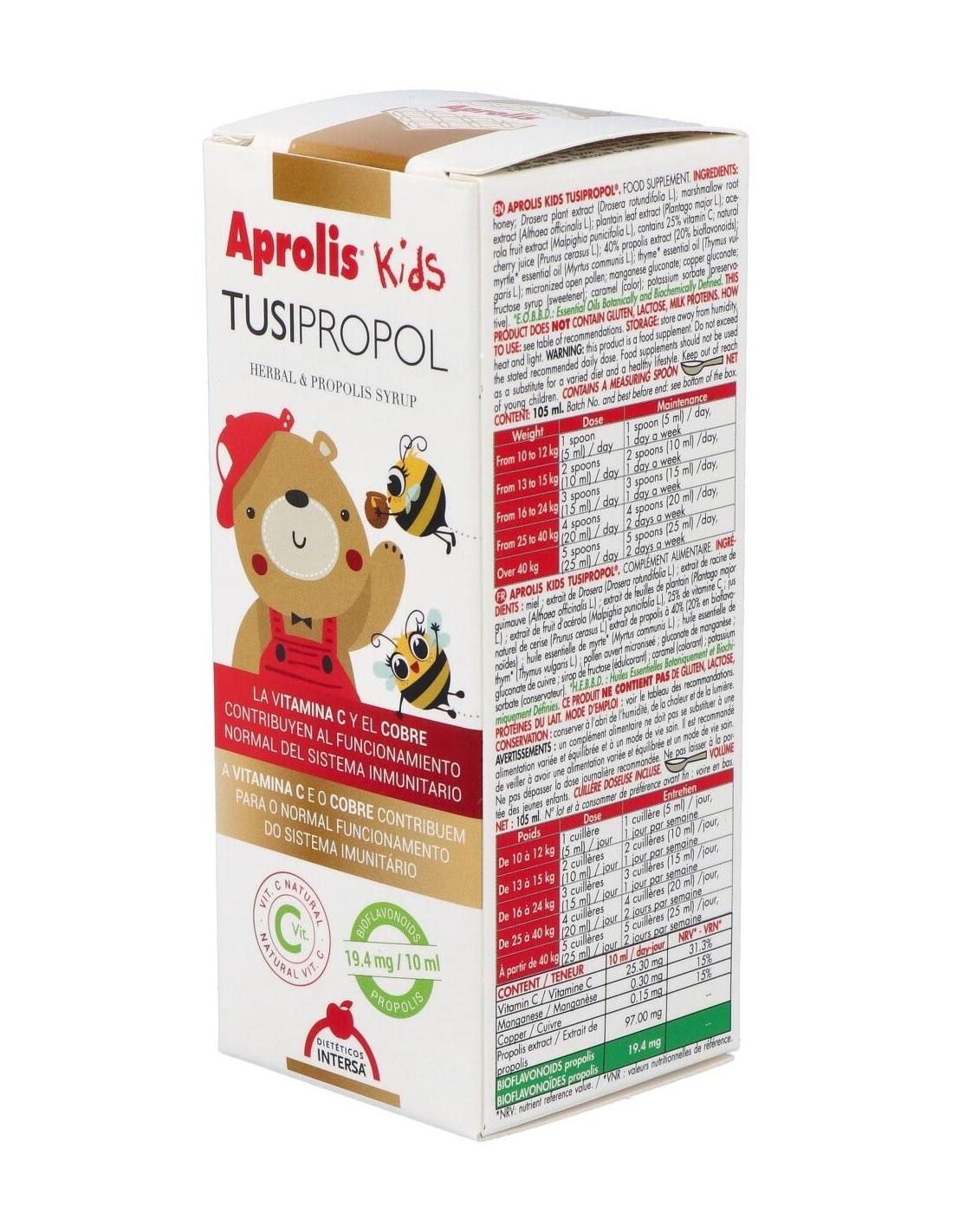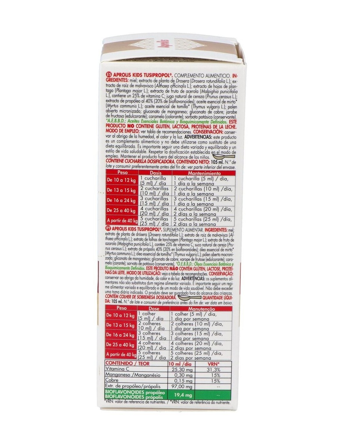 Complemento alimenticio que contribuye al funcionamiento normal del sistema inmunitario y calma la tos gracias al extracto de drosera. Compuesto de propóleo, extractos de plantas, cobre y vitamina C. Indicado para los más pequeños de la casa, cuando cursan resfriados, gripes, faringitis o convalecencias. Como preventivo, aumentando las defensas del organismo. Este producto no tiene gluten, lactosa, ni proteínas de la leche. Incluye cucharilla dosificadora.