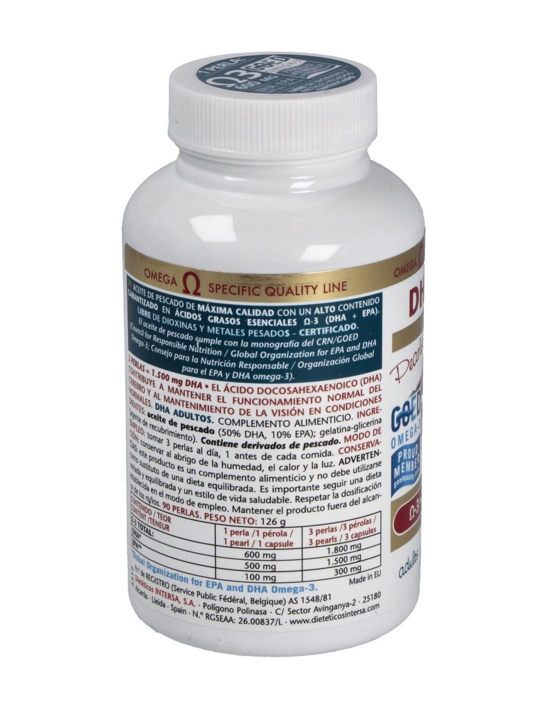 ACEITE DE PESCADO SALVAJE PELÁGICO (50% DHA, 10% EPA). EXCIPIENTES: PERLAS DE GELATINA GLICERINA (ENVOLTURA DE LA PERLA).CONTIENE DERIVADOS DE PESCADO.
