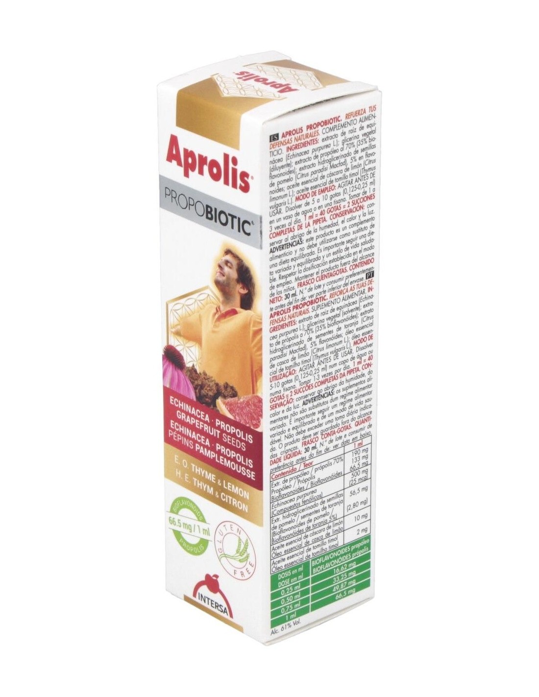 Complemento alimenticio que ayuda a reforzar las defensas con equinácea, propóleo, semillas de pomelo y aceites esenciales de tomillo y limón. Extractos de plantas y de propóleo obtenidos por maceración en alcohol procedente de la fermentación de vegetales BIO (bioetanol). no contiene propilenglicol - no contiene alcohol etílico. 100% natural.