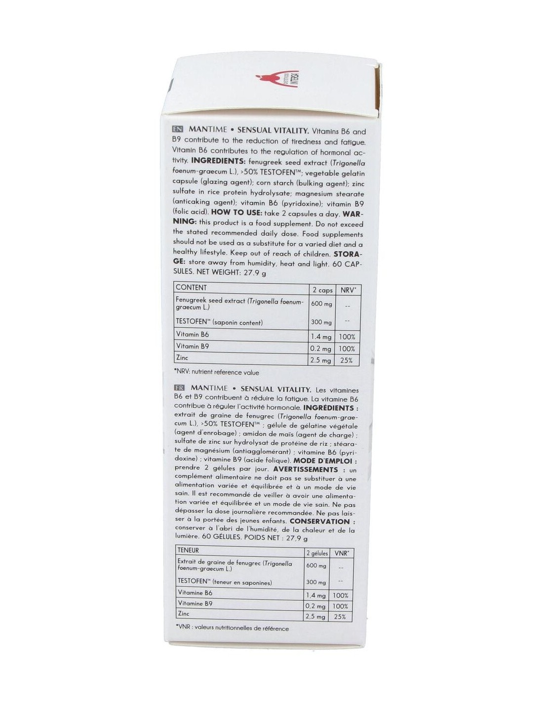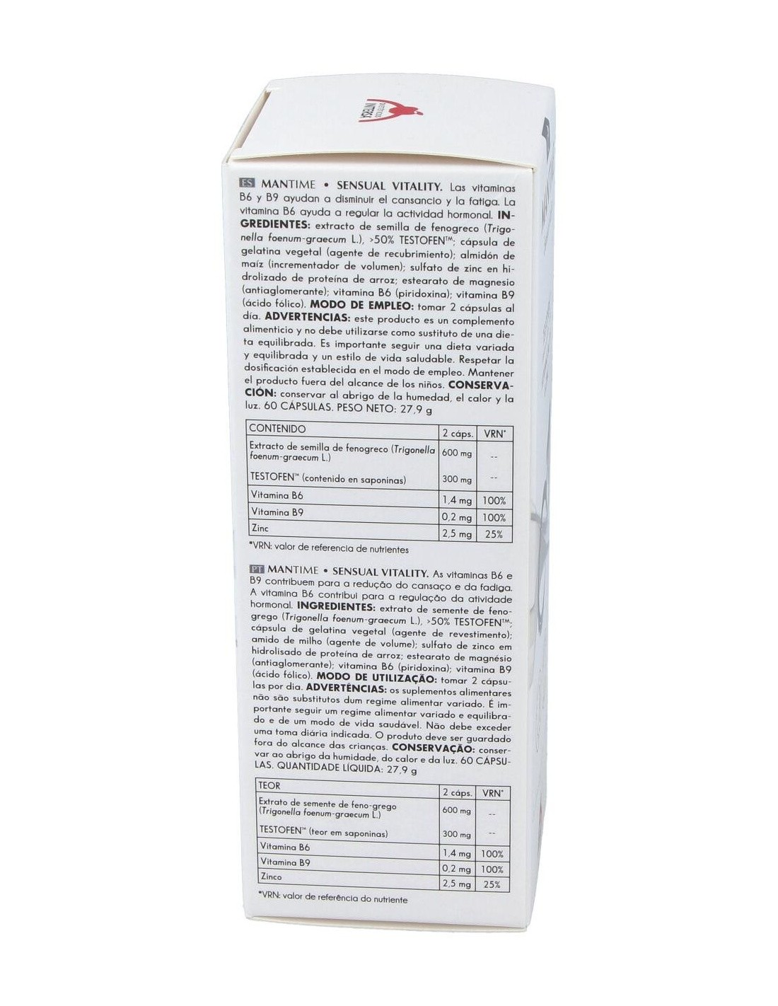 Complemento alimenticio diseñado para contribuir en el rendimiento sexual de hombres jóvenes y en la andropausia. Contiene vitamina B6 para ayudar a regular la actividad hormonal, zinc que participa en la reproducción normales y la vitamina B9 que favorece la disminución del cansancio. Con TESTOFEN, rico en vitaminas y minerales que ayudan al normal funcionamiento del sistema reproductivo.