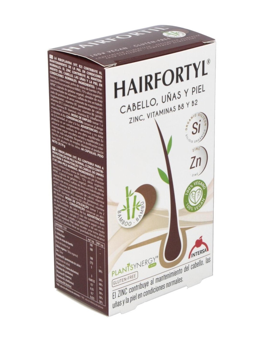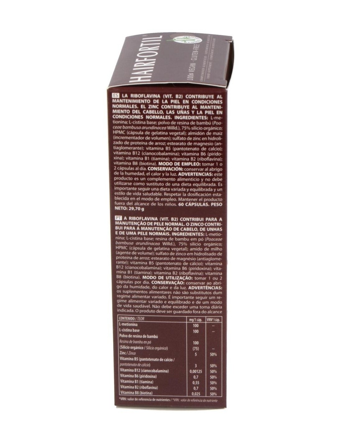 Complemento alimenticio que contribuye al mantenimiento del cabello, piel y uñas en condiciones normales. 100 % vegano. El zinc contribuye al mantenimiento de la piel, las uñas y el cabello en condiciones normales. La vitamina B2 contribuye al mantenimiento de la piel en condiciones normales. La vitamina B6 contribuye a la síntesis normal de la cisteína. La vitamina B8 (Biotina) contribuye al mantenimiento de la piel y el cabello en condiciones normales. La cisteína es un aminoácido que forma parte de las estructuras de la piel y las uñas.