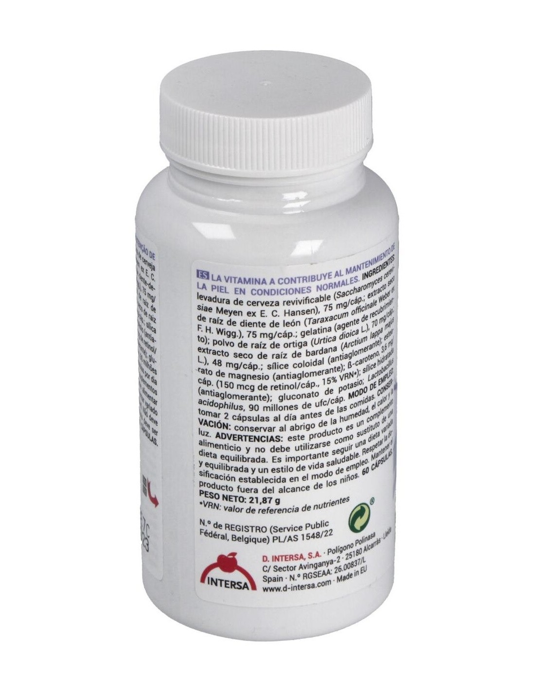 Retinol, Sílice Hidratada, Extracto seco de raíz de bardana, Polvo de raíz de ortiga, Extracto seco de raiz de diente de leon, Levadura de cerveza revivificable, Potasio gluconato, Gluconato de potasio, Caroteno, Diente de León, Alfa caroteno, Sílice coloidal, Lactobacillus Acidophilus, Gelatina, Extracto de bardana, Levadura De Cerveza, Ortiga, Estearato de magnesio.