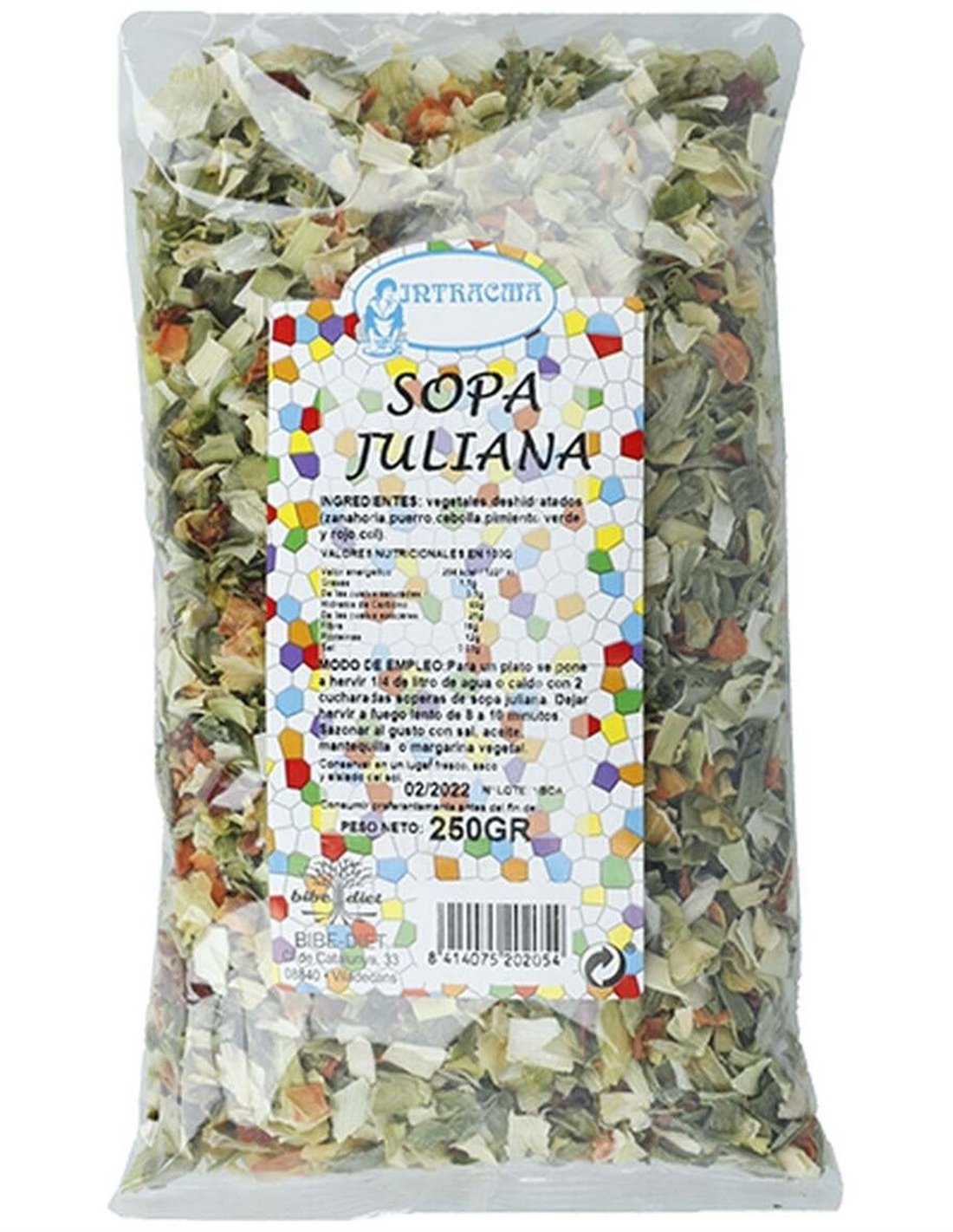 Conjunto de verduras deshidratadas en juliana para elaborar sopas. Con ingredientes orgánicos, procedentes de agricultura ecológica. Para consumir agregar agua hirviendo a gusto. Puede contener trazas de frutos secos, soja, sésamo y cereales que contiene gluten.