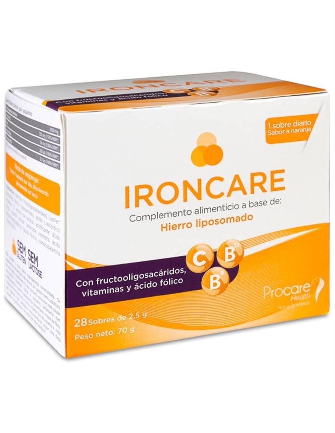 IRONCAREComplemento alimenticio a base de hierro (Lipofer®), vitamina C, vitamina B12 y ácido fólico (vitamina B9) y fructooligosacáridos. Hierro en forma de Lipofer®, (pirofosfato de hierro liposomado que facilita su absorción). El ácido fólico (vitamina B9), ayuda a la formación de células sanguíneas. La Vitamina C ayuda a reducir el cansancio y la fatiga y mejora la absorción de hierro. La vitamina B12, contribuye a la formación normal de glóbulos rojos y a reducir el cansancio y la fatiga.