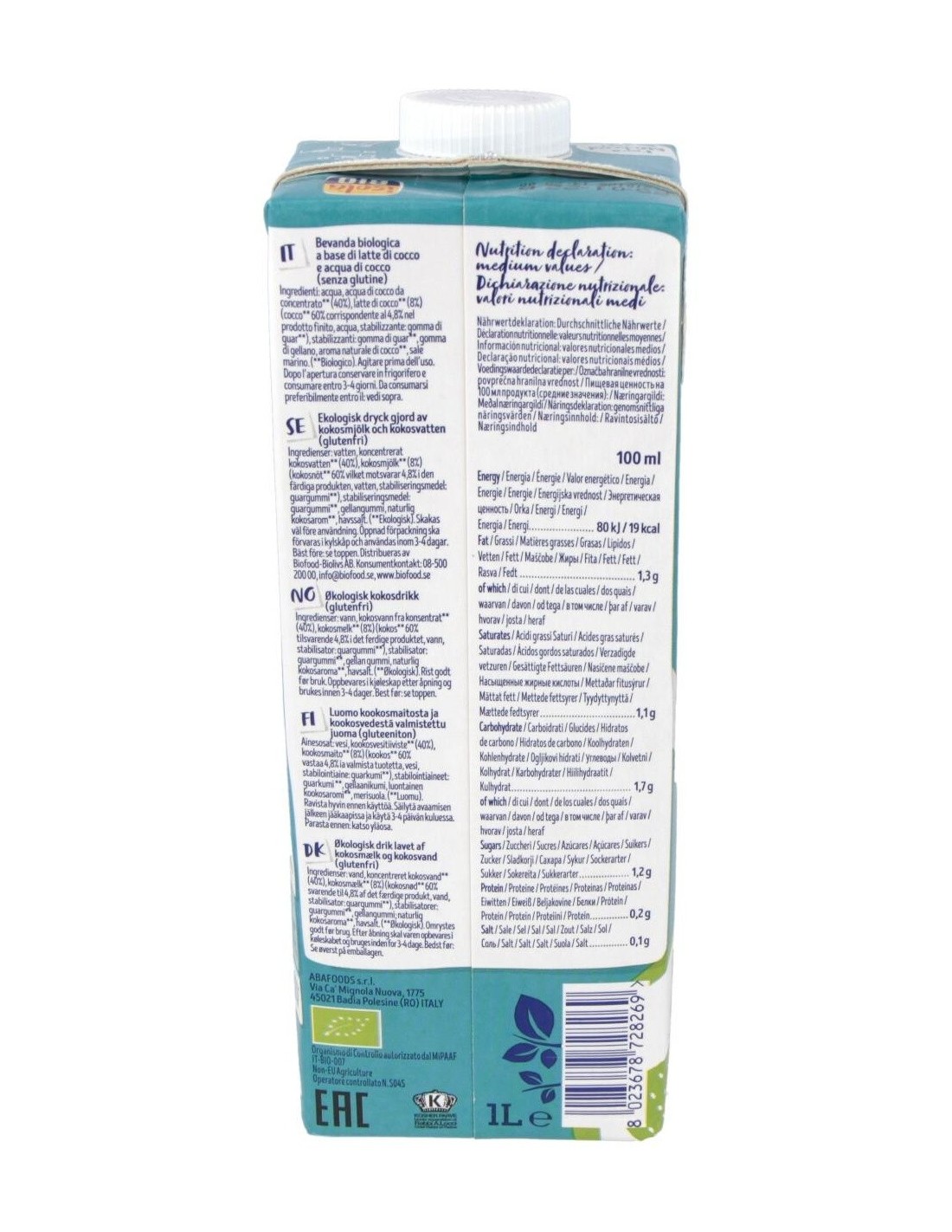 Agua, arroz* (17%), avellanas* (3%), sal marina. Valor nutricional por 100 g: Energía 312 kJ/74 Kcal Grasas 1,9 g de las cuales saturadas 0,2 g Hidratos de carbono 13 g de los cuales azúcar 5,5 g Fibra alimentaria 0,9 g Proteínas 0,8 g Sal 0,08 g (*)= de cultivo ecológico. + Puede contener trazas de otros frutos de cáscara.