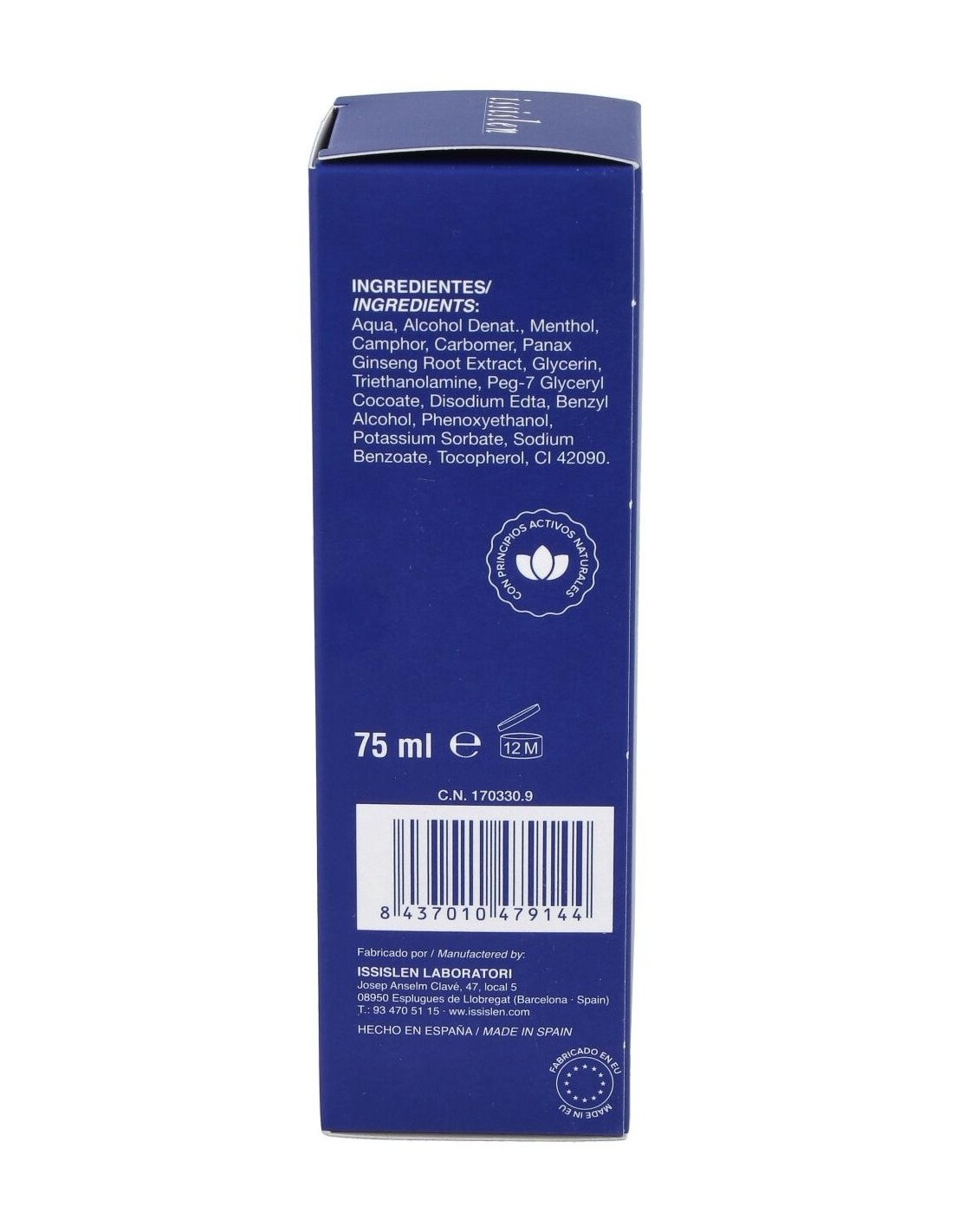 Aqua, Alcohol denat., Menthol, Camphor, Carbomer, PEG-7 Glyceryl Cocoate, Eleuterococo, Triethanolamine, Phenoxyethanol, Methylparaben, Butylparaben, Ethylparaben, Propylparaben.