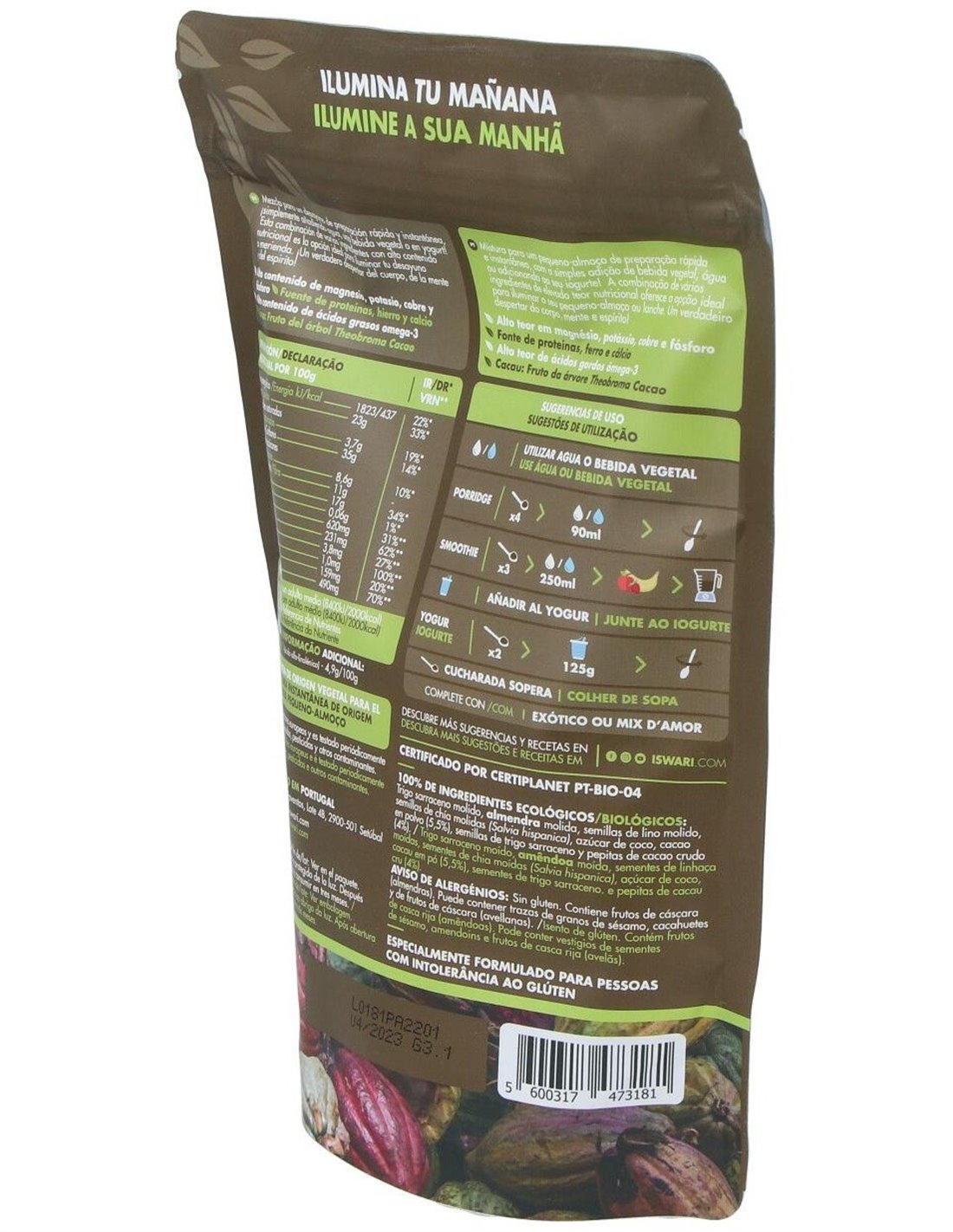 Trigo Sarraceno molido, Almendra molida, Lúcuma en polvo, Semillas de Chia molidas, Semillas de linaza molida, Azúcar de Coco, Cacao en polvo, Trigo Sarraceno activado y Pepitas de Cacao.