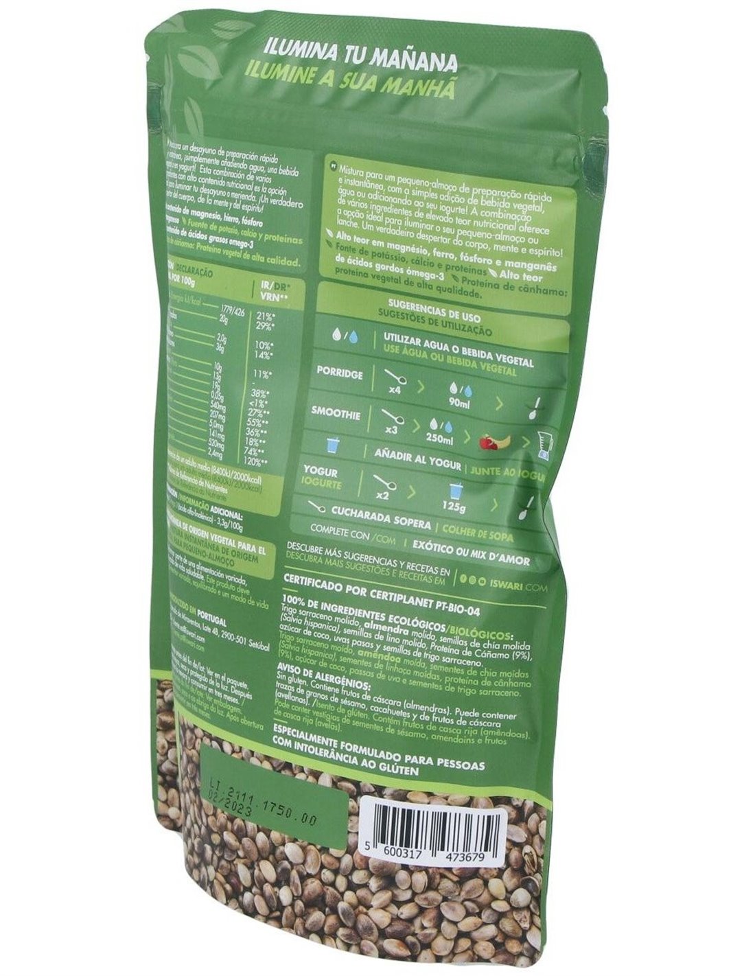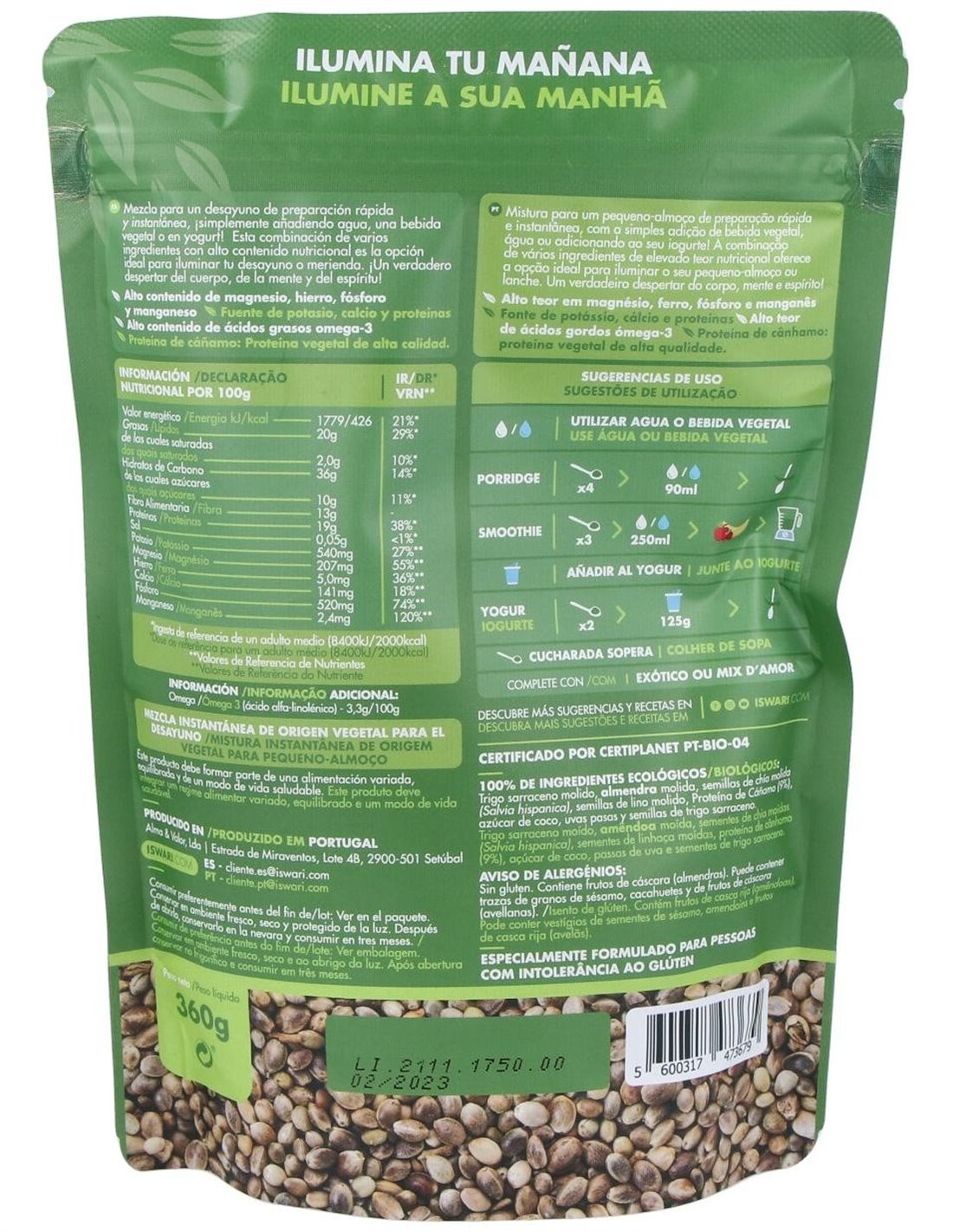 Trigo Sarraceno molido, Almendra molida, Lúcuma en polvo, Semillas de Chía molidas, Semillas de linaza molida, Azúcar de Coco, Proteína de Cáñamo, Pasas de Uva.