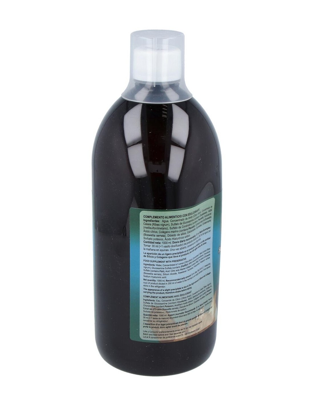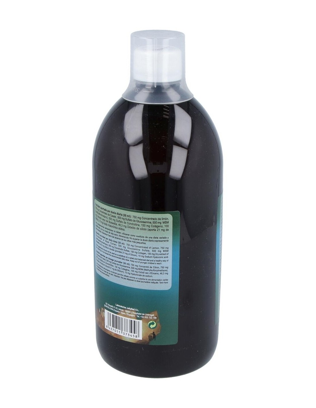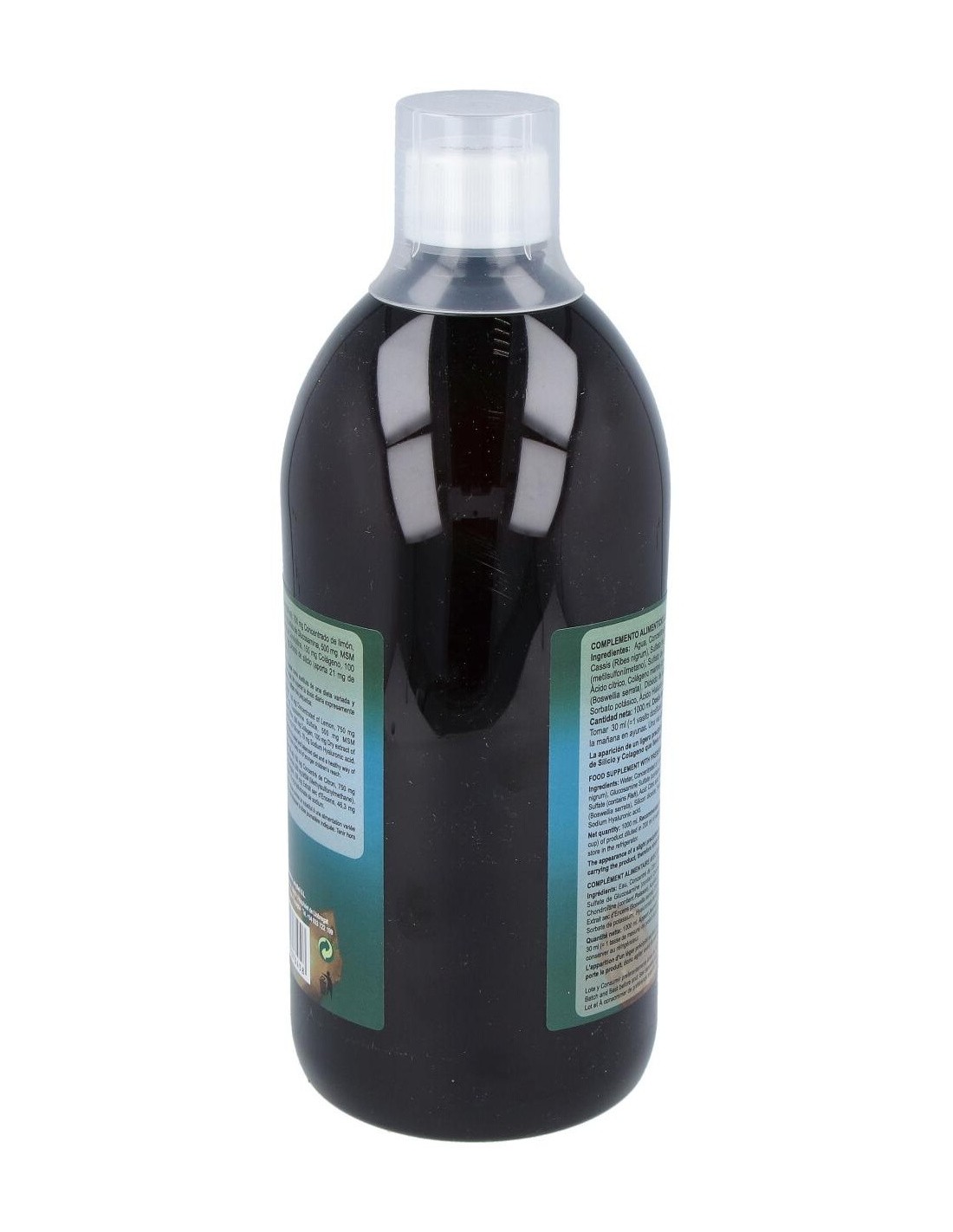 750 mg Concentrado de limón, 750 mg Concentrado de Cassis , 500 mg Sulfato de Glucosamina, 500 mg MSM (metilsulfonilmetano), 500 mg Sulfato de Condroitina, 150 mg Colágeno, 100 mg Extracto seco de Boswellia, 46,3 mg Dióxido de silicio (aporta 21 mg de Silicio), 10 mg Ácido Hialurónico sódico.