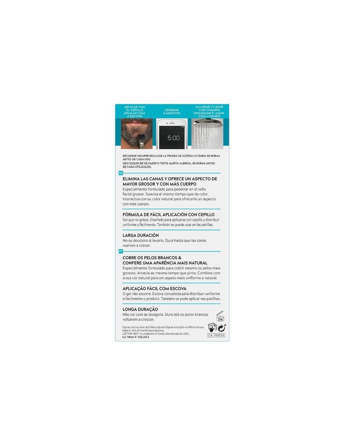 Elimina las canas para lograr un aspecto de mayor grosor y con más cuerpo. Suaviza al mismo tiempo que da color. Coloración con cepillo de fácil aplicación. Fórmula más cremosa. Aplicación más fácil. Con biotina, aloe y aceite de coco. Resultados en 5 minutos. Dura hasta que las canas vuelven a crecer.