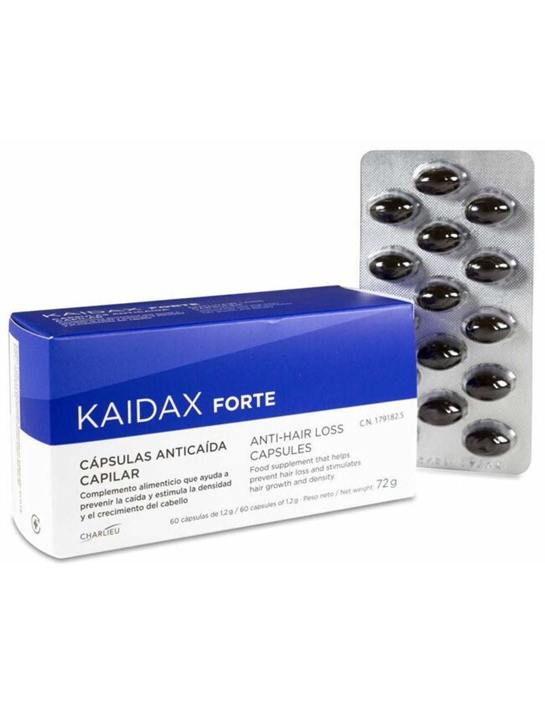 KAIDAXKaidax Forte es un complemento nutricional para el cabello que actúa a diferentes niveles y que incorpora en su fórmula: Dos potentes activos semilla de calabaza y Sabal Serrulata que ayudan en la fase de crecimiento del cabello. Combinación única de aminoácidos que forman parte de la queratina del cabello, L-cistina y Taurina: Potentes antioxidantes que ayudan a proteger las células frente al daño oxidativo y Vitamina E. Con Vitaminas y oligoelementos que contribuyen al mantenimiento del cabello en condiciones normales (Vitaminas B5, B6, B8, Zinc, Cobre y Selenio)