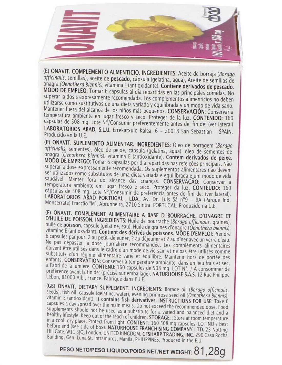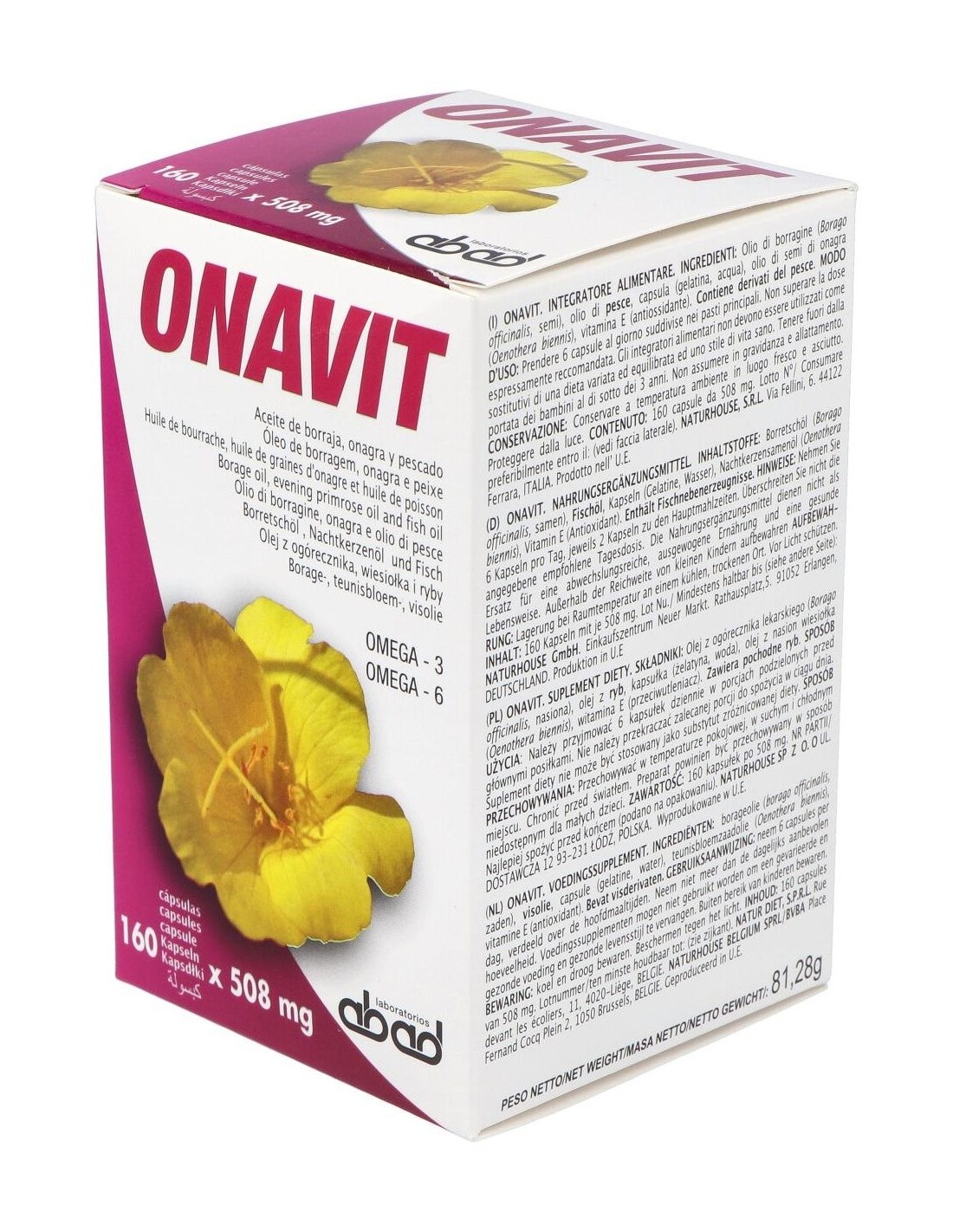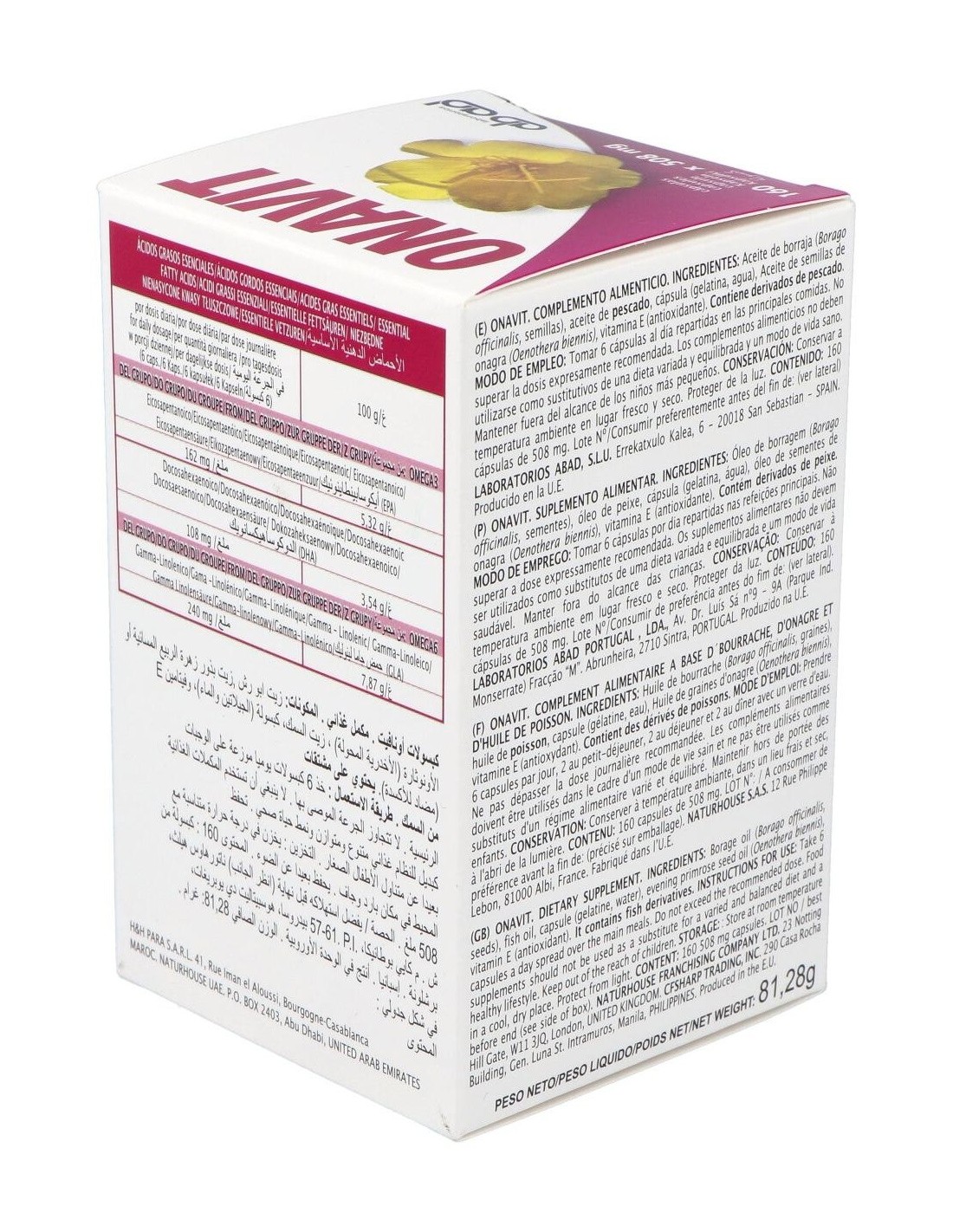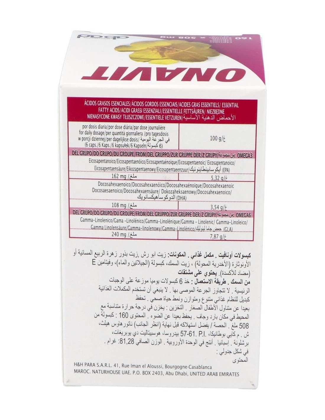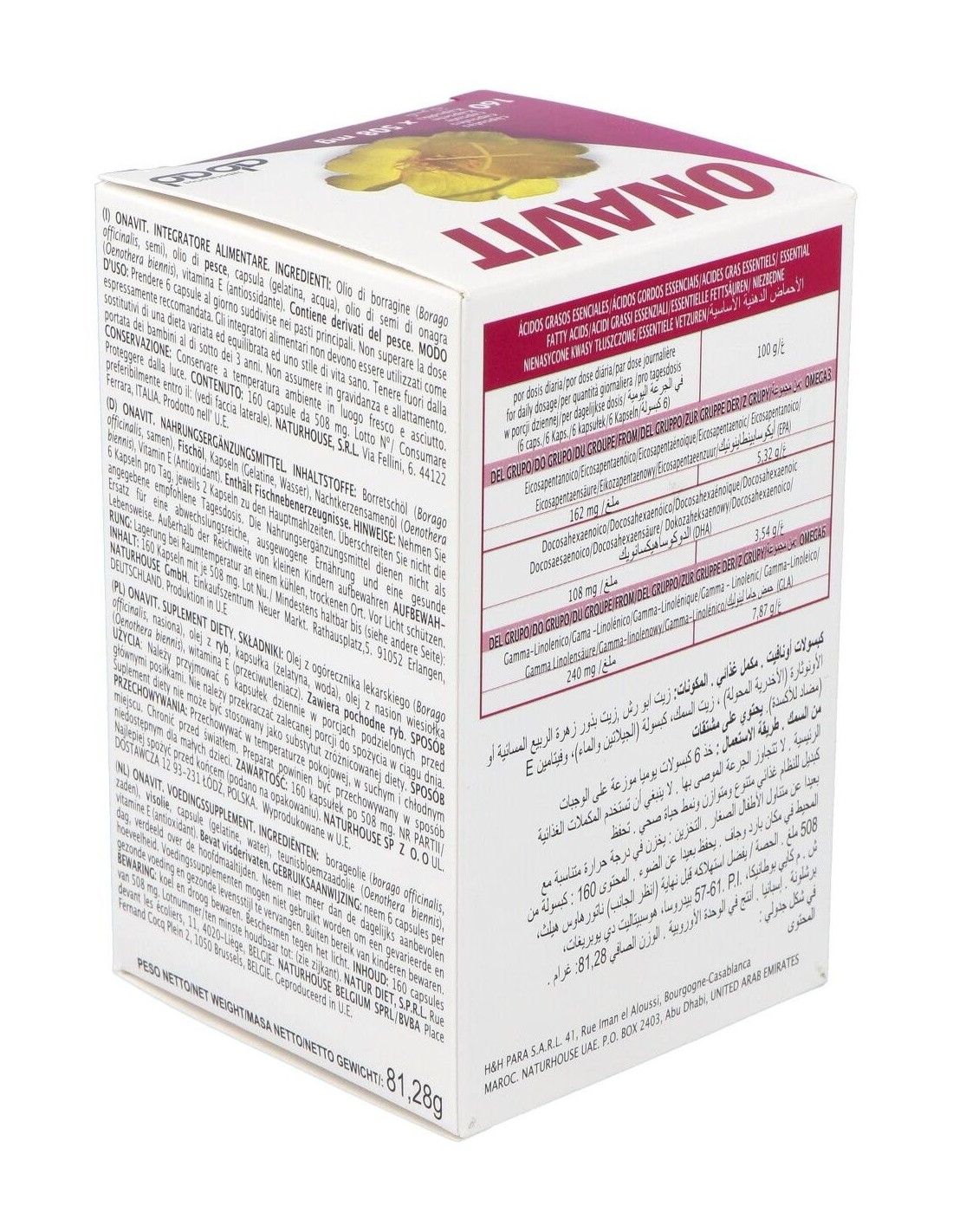 Aceite de borraja (Borago officinalis (20%GLA)), aceite de pescado (18% EPA/ 12% DHA)),capsula (gelatina, agua), aceite de semillas de onagra (Oenothera biennis (10% GLA)), vitamina E (antioxidante).