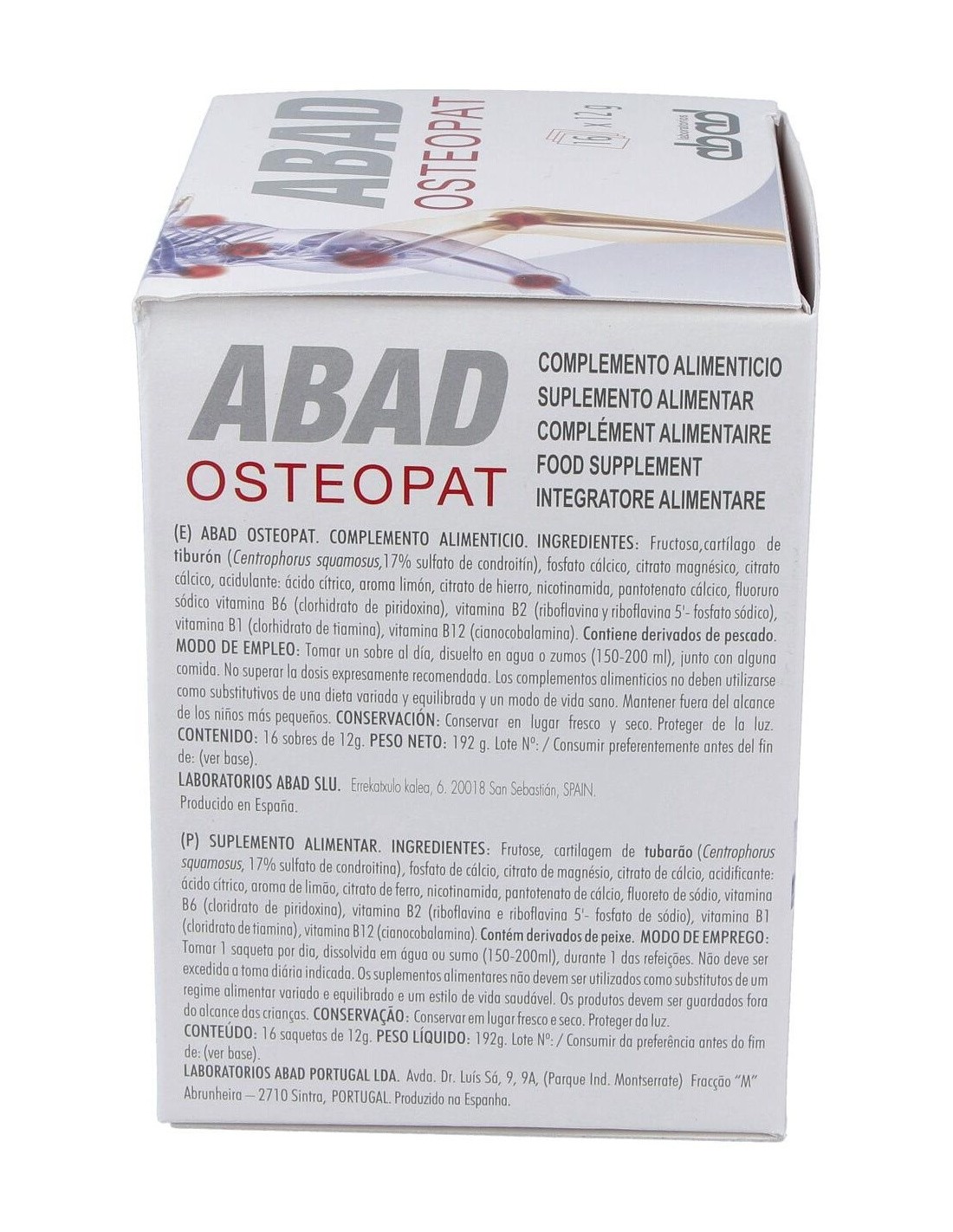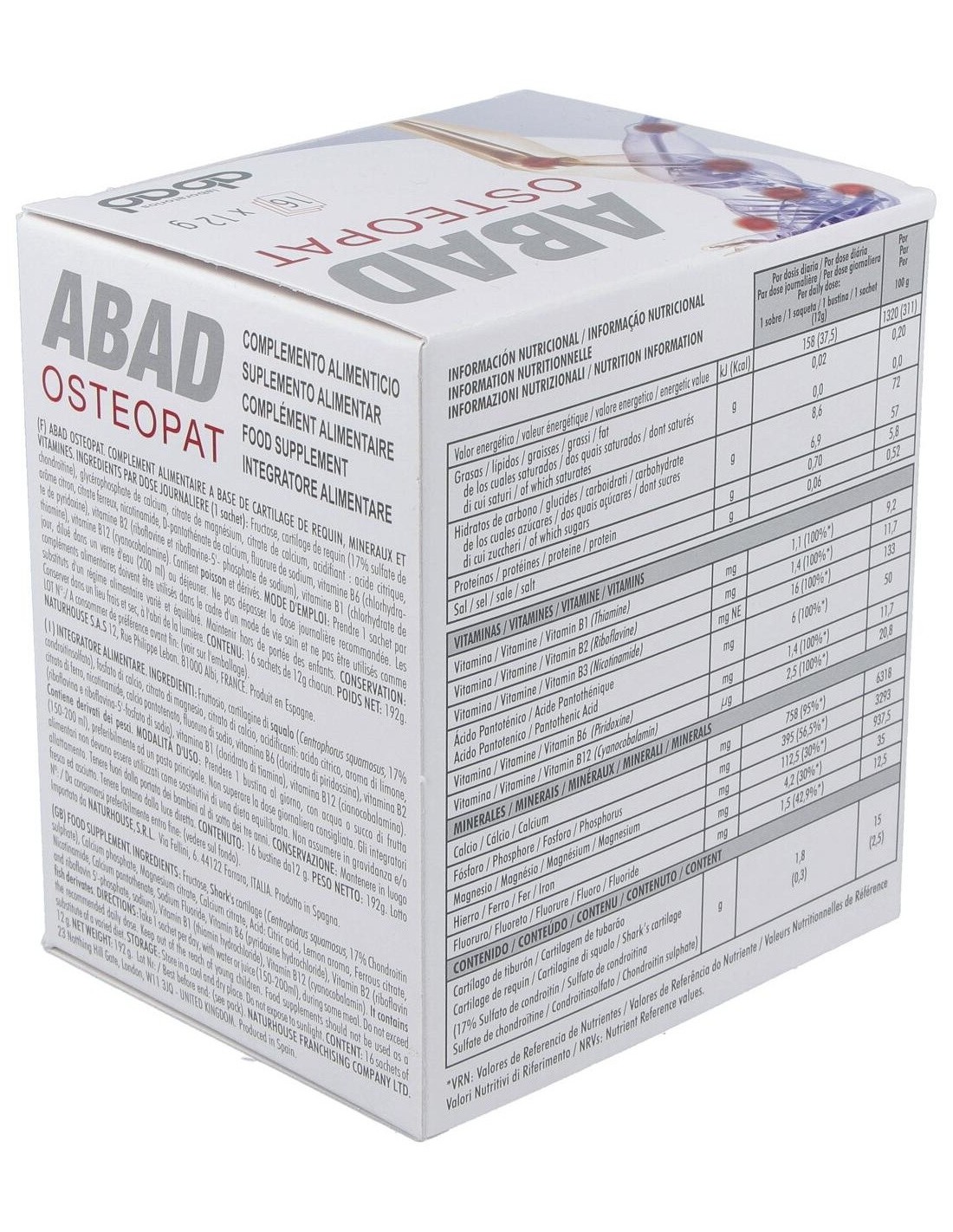 Cartílago de Tiburón (18% condroitín sulfato sódico), fosfato cálcico dibásico, citrato cálcico, citrato magnésico, citrato ferroso, nicotinamida, pantotenato cálcico, vitamina B6, B2, B1, B12, fluoruro sódico, ácido cítrico, aroma de limón y fructosa.