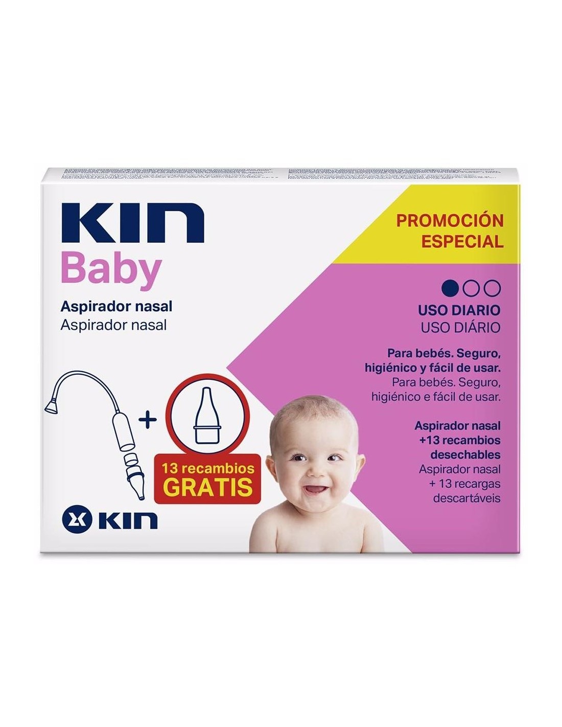 KINAyuda a eliminar la mucosidad que se acumula de manera indolora, higiénica y efectiva. Al funcionar mediante aspiración se puede controlar el grado de intensidad, de manera que no resulte demasiado molesto para el bebé. Incluye recambios desechables.