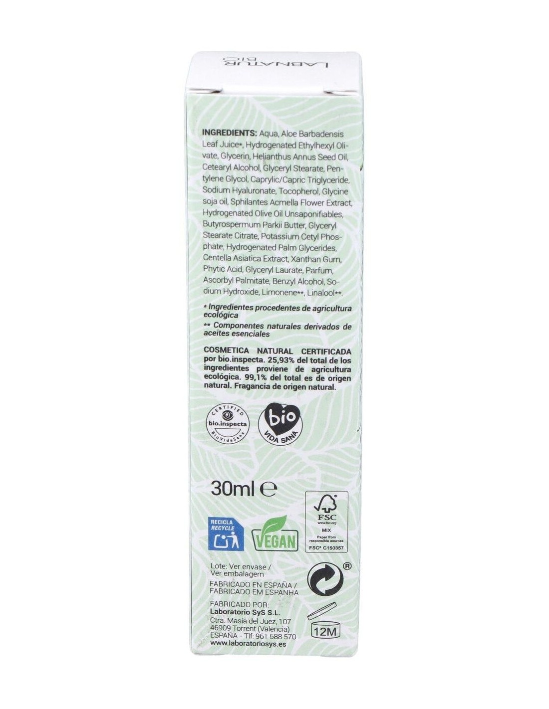 Ayuda a reducir visiblemente las arrugas, aumenta la firmeza y revitaliza la piel. Reúne las propiedades de los principios activos que la componen: Ácido Hialurónico, Vitamina E, Centella Asiática, Aloe Vera, Karité y Acmella. El Ácido Hialurónico reconstituye las fibras que sostienen los tejidos de la piel: la Vitamina E mejora la acción antioxidante y fotoprotectora: la Centella Asiática estimula la síntesis del colágeno, reafirmante y reepitelizante: el Aloe Vera nutre y limpia la piel. Regenerador celular, cicatrizante y tonificador: la Manteca de Karité hidrata y es antiirritante: la Acmella reafirma la piel y reduce las arrugas. Cosmética Natural Certificada por bio.inspecta con ingredientes de procedencia ecológica, ingredientes de origen natural y fragancia natural.