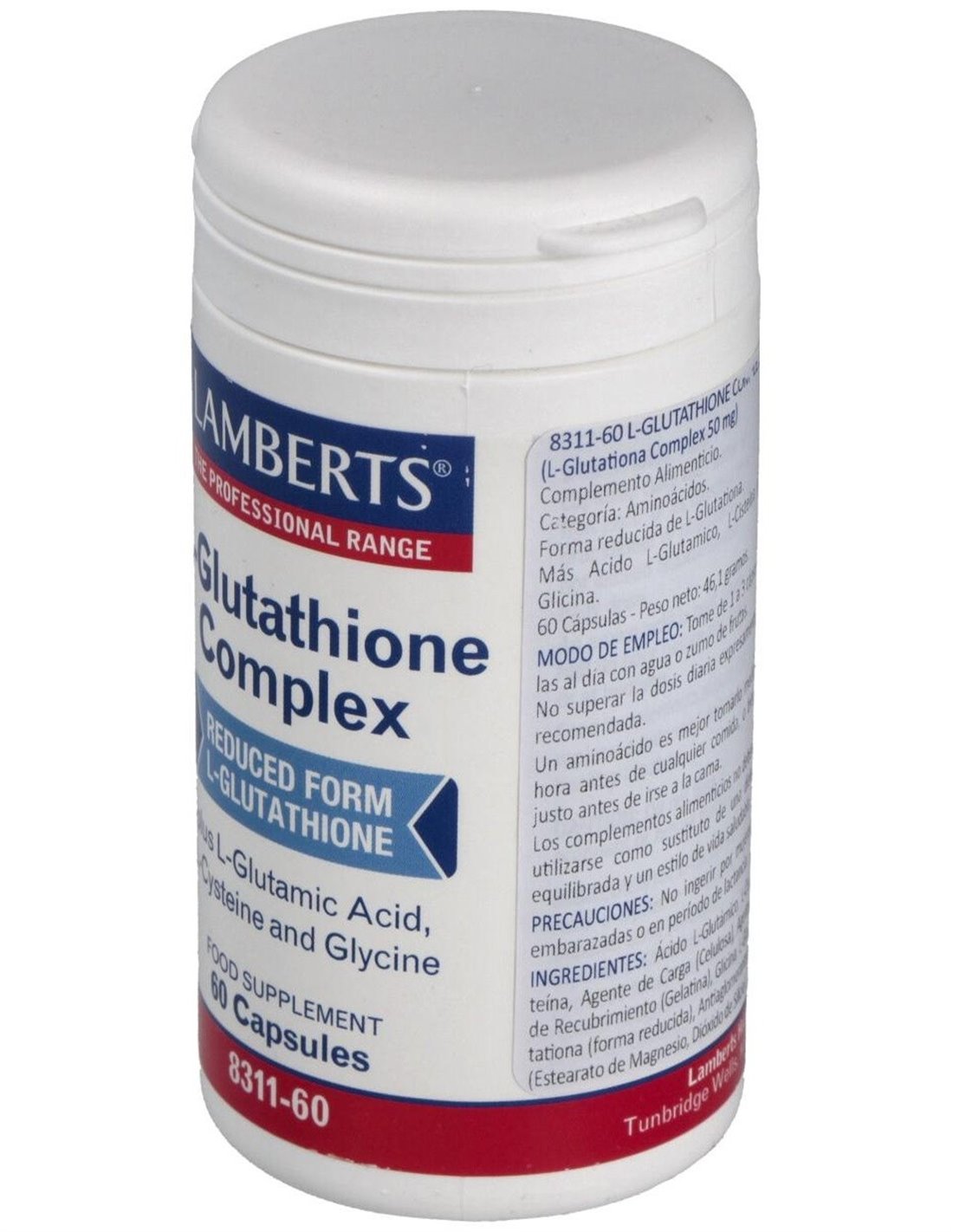 Complemento alimenticio que ayuda a proporcionar buenos niveles de varios aminoácidos, además de glutationa absoluta. Se utiliza tradicionalmente como desintoxicante natural e incluso como ayuda inmune. Puede reforzar la detoxificación, especialmente en personas con una carga tóxica elevada y está implicada en la formación de eritrocitos y de glóbulos blancos. L-Glutationa Complex contiene buenos niveles de cada péptido junto con glutationa ya formada para maximizar su absorción. La L-glutationa de Lamberts es un tripéptido compuesto por ácido glutámico, cisteína y glicina que forma parte de la enzima glutationa peroxidasa, uno de los antioxidantes más potentes del organismo. La glutatión se encuentra en todas las células en el cuerpo, con la más alta concentración en el hígado. Dado que puede formarse a partir de estos tres aminoácidos en el cuerpo, se considera no esencial porque no tiene que ser obtenido de los alimentos.