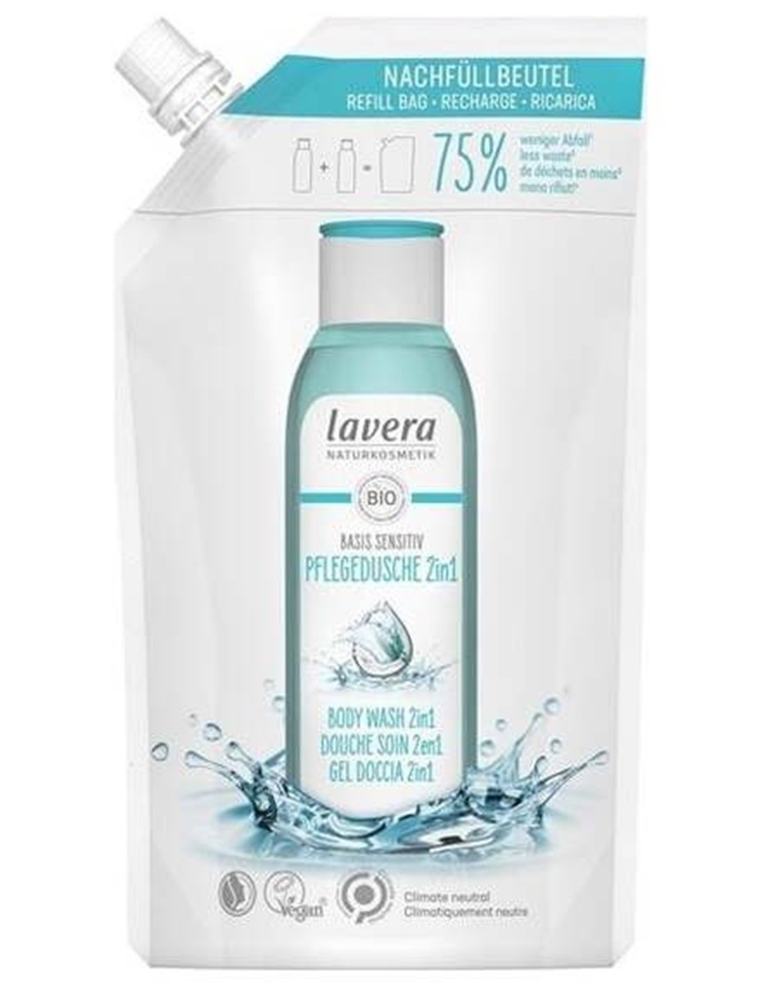 Eco-recargas que equivale a 2 botellas Gel de ducha & champú 2en1 Basis sensitiv de Lavera. Ahora un 75% menos de plástico (comparado con 2 botellas).