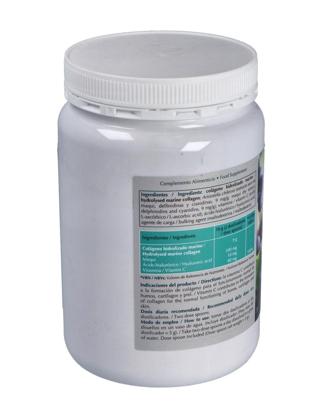 Hidrolizado de colágeno marino, 9 g: Aristotelia chilensis (maqui), 200 mg: vitamina C, 80 mg: ácido hialurónico, 10 mg.