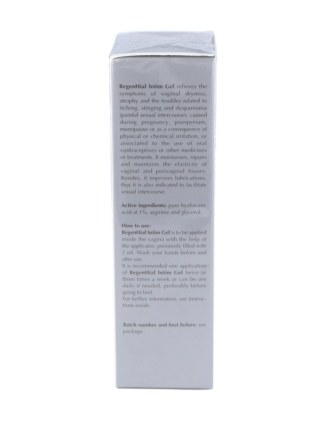 Gel hidratante y reparador vaginal de uso interno con ácido hialurónico al 1%, arginina y glicerol. Está especialmente indicado para aliviar los síntomas de la sequedad vaginal, atrofia y molestias relacionadas con el picor, el escozor y la dispareunia, producidas por reducción estrogénica, irritación física o química, anticonceptivos, medicamentos, etc. Su aplicación se recomienda también después de tratamientos de corrección de suelo pélvico, así como para mejorar la lubricación y facilitar las relaciones sexuales.