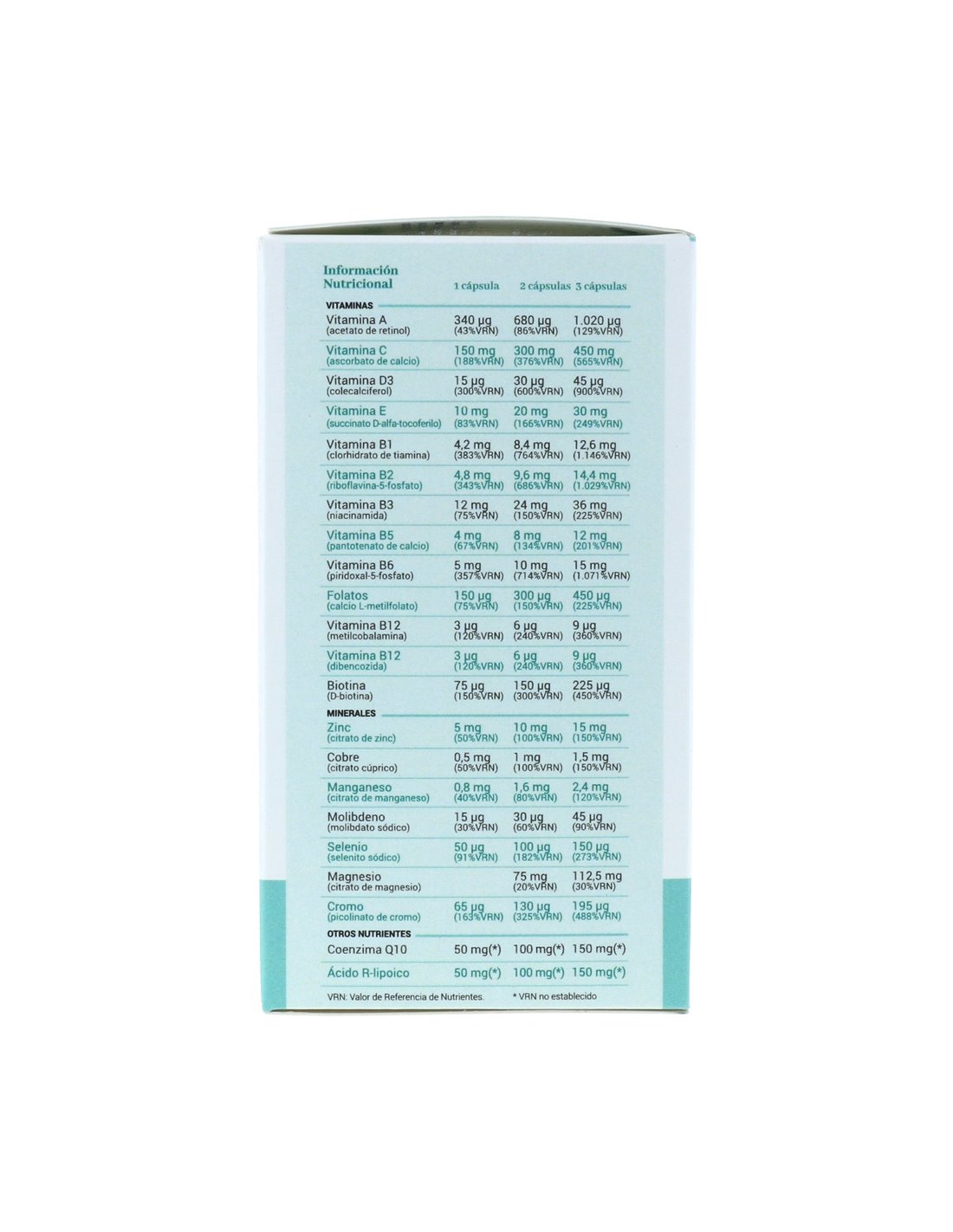 Aporta los nutrientes básicos en una adecuada combinación para que actúen entre ellos de forma sinérgica, con las formas más activas y biodisponibles, ayudando al bienestar general del organismo. Apto para veganos.
