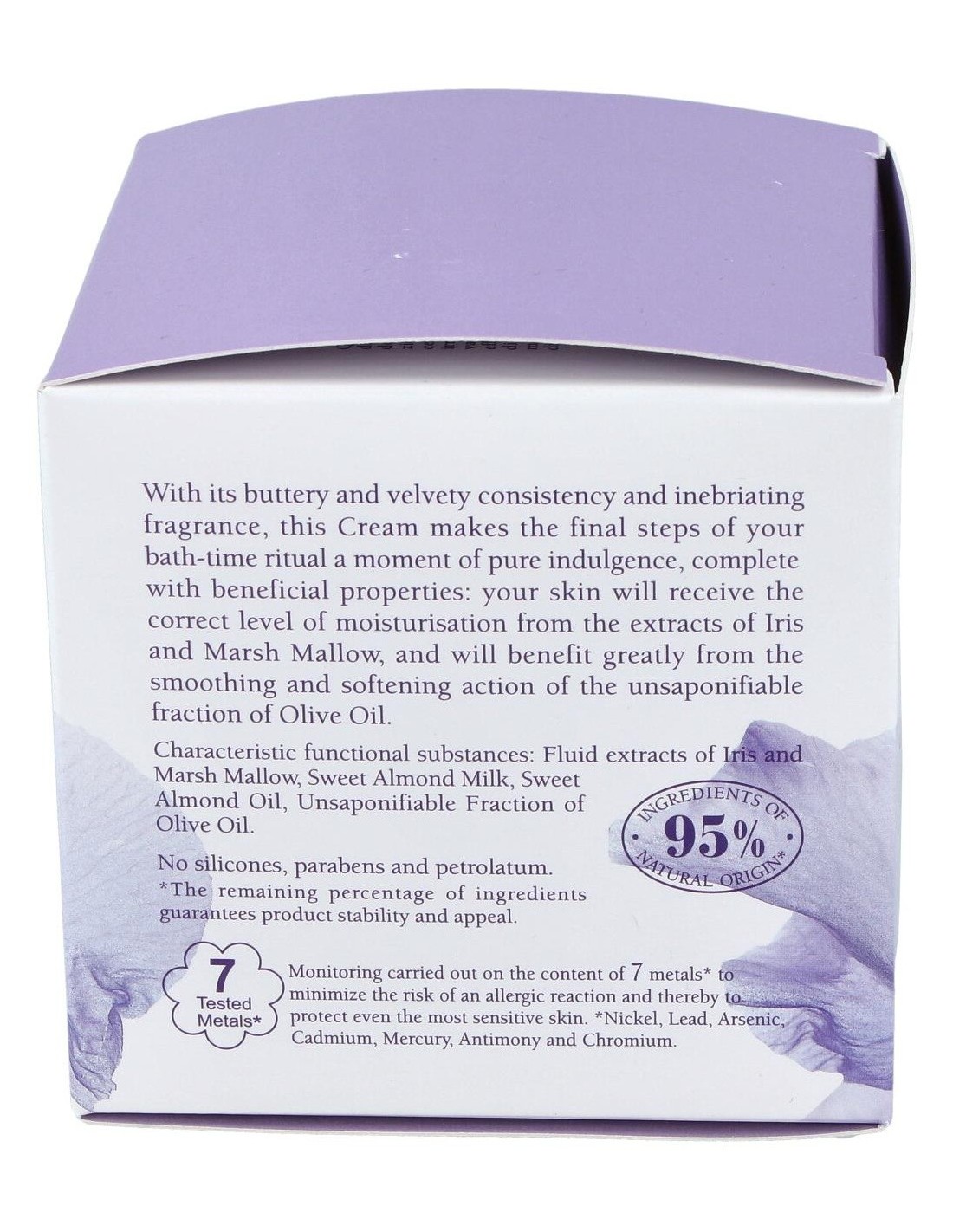 Emulsión muy rica y aterciopelada con una fragancia embriagadora. La piel recibe la hidratación adecuada de los extractos de Iris y Altea y se beneficia de la acción aterciopelada y suavizante del aceite de oliva. Sin siliconas, parabenos ni vaselina.
