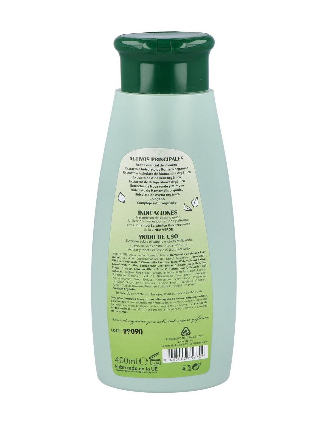 HAMAMELIS, AVENA, ALOE VERA, ORTIGA BLANCA, MANZANILLA Y ROMERO ORGÁNICOS, NUEZ VERDE, MIMOSA, LEVADURA Y CASTAÑO DE INDIAS), VITAMINAS, SALES DE ZINC Y ACEITE ESENCIAL DE ROMERO