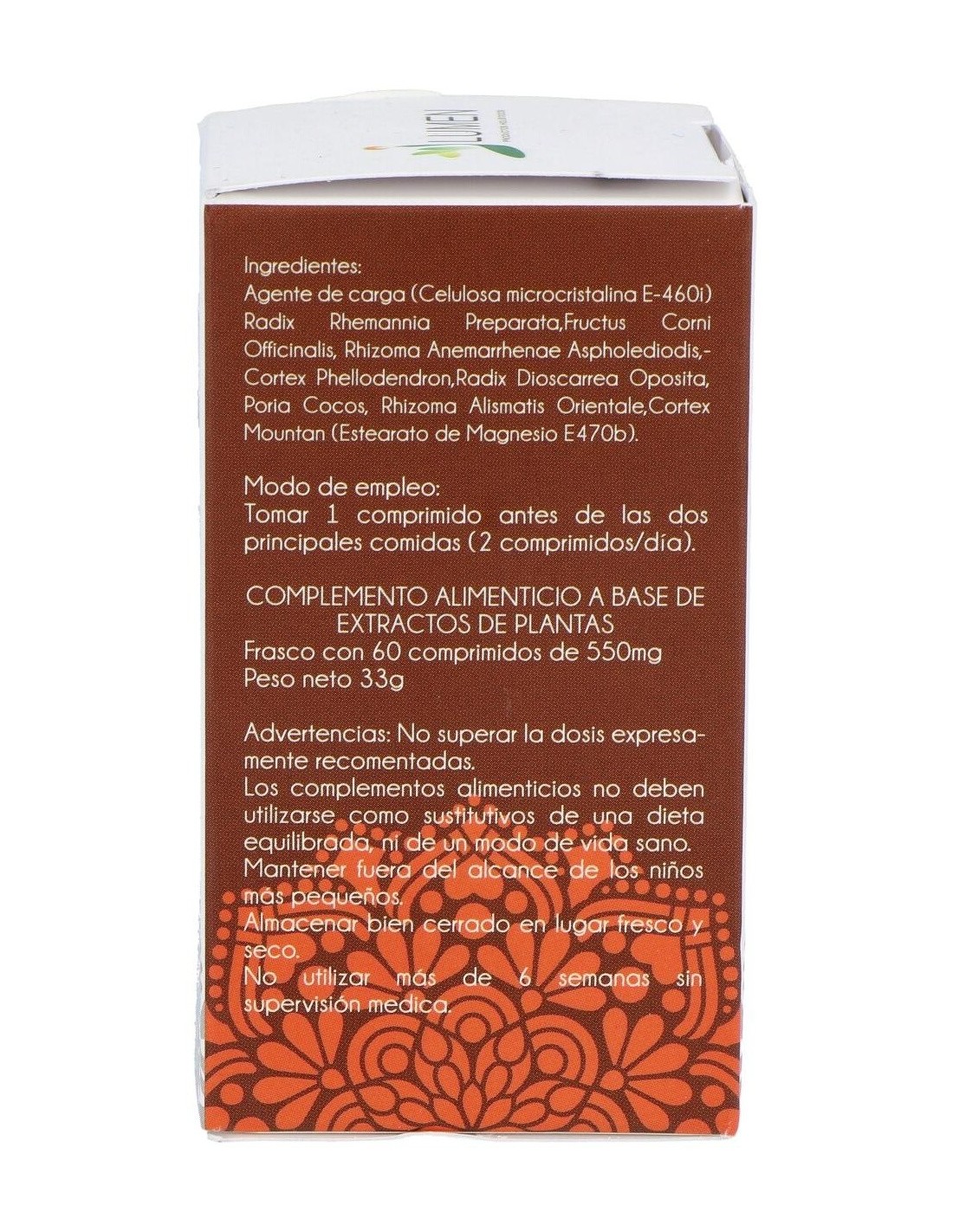 Radix Rehmania Glutinosa Preparada, Fructus Corni Oficinalis, Radix Dioscorrea Oppositae, Rhizoma Alismatis Orientalis, Cortex Mountan Radicis, Poria Cocos, Cortex Phellodendri, Rhizoma Anemarrhenae.