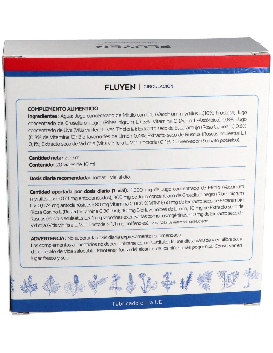 6.300 MG DE JUGO CONCENTRADO DE MIRTILO, 1.800 MG DE JUGO CONCENTRADO DE CASSIS, 447 MG DE JUGO DE UVA TINTA, 60 MG DE EXTRACTO SECO DE ESCARAMUJO, 60 MG DE VITAMINA C, 40 MG DE BIOFLAVONOIDES, 10 MG DE EXTRACTO SECO DE RUSCO, 10 MG DE EXTRACTO SECO DE VID ROJA.