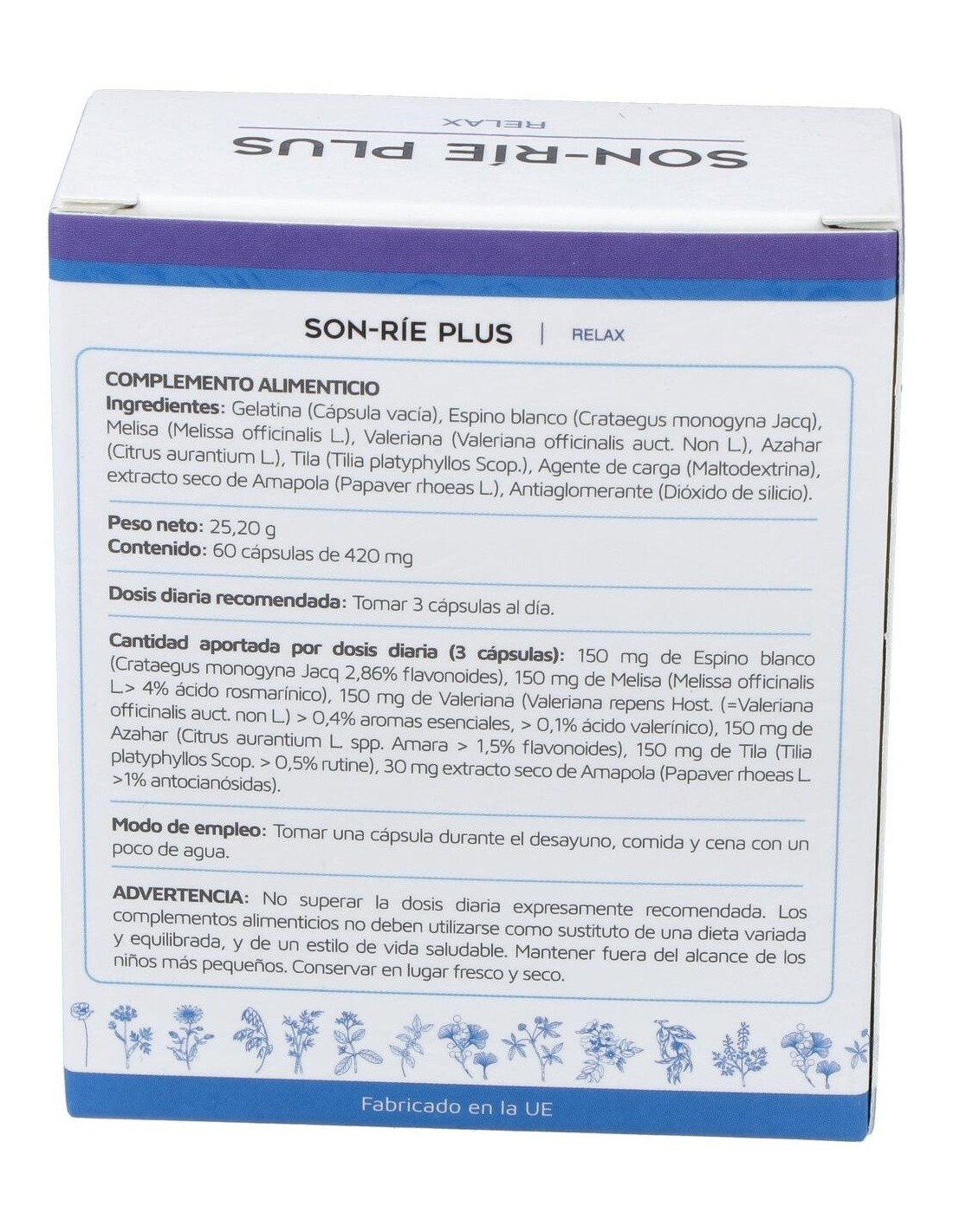 Gelatina (Cápsula vacia): Espino blanco (Crataegus monogyna Jaq) 11.90% (50 mg/cáps): Melisa (Melissa officinalis L.) 11.90% (50 mg/ cáps): Azahar (Citrus aurantium L.) (50mg/ cáps): Valeriana (Valeriana officinalis auct. Non L.) 11.90 (50mg/cáps): Tila (Tilia plathyphyllos Scop.): 11.90% (50 mg/cáps): Agente de carga (Maltodextrina): Amapola (Papaver rhoeas L) 2,38 % (10 mg/cáps) Antiaglomerante (Dióxido de Silicio).