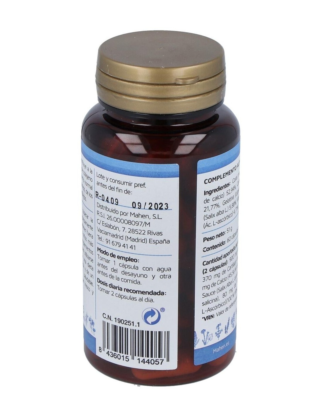 900 mg de Coral Marino, 370 mg de Cartílago de tiburón, 364,5 mg de Calcio, 100 mg de Sauce, 80 mg de Vitamina C.