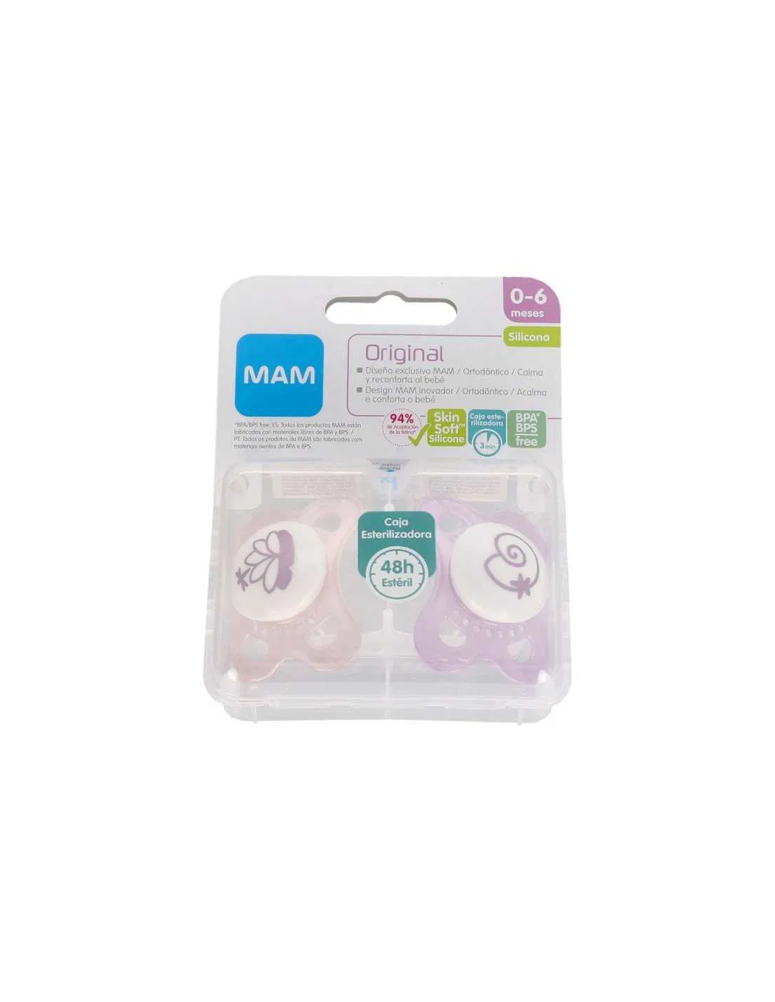 La tetina MAM es anatómicamente correcta para el desarrollo de la mandíbula y los dientes del bebé, y se adapta individualmente. Este pack de dos chupetes en color amarillo incluye una caja de esterilización y transporte para mayor comodidad.