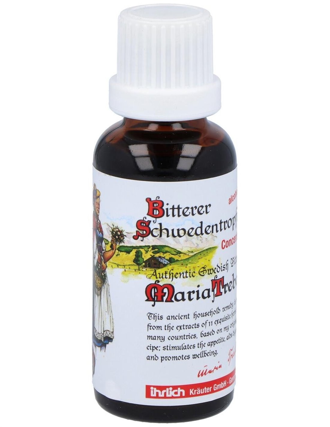 Extracto de hierbas suecas sin alcohol. Alternativa para los niños, así como personas mayores, intolerantes al alcohol y abstemias, que quieran experimentar con la formulación de plantas del Amargo Sueco según receta de Maria Treben. Formulado con los principios activos de las plantas de la tradicional. Los 30 ml de concentrado sirven para la elaboración con alcohol de calidad alimentaria de una tintura de 0,7 litros de volumen. Ayuda a mejorar el bienestar y fortalecer el cuerpo.