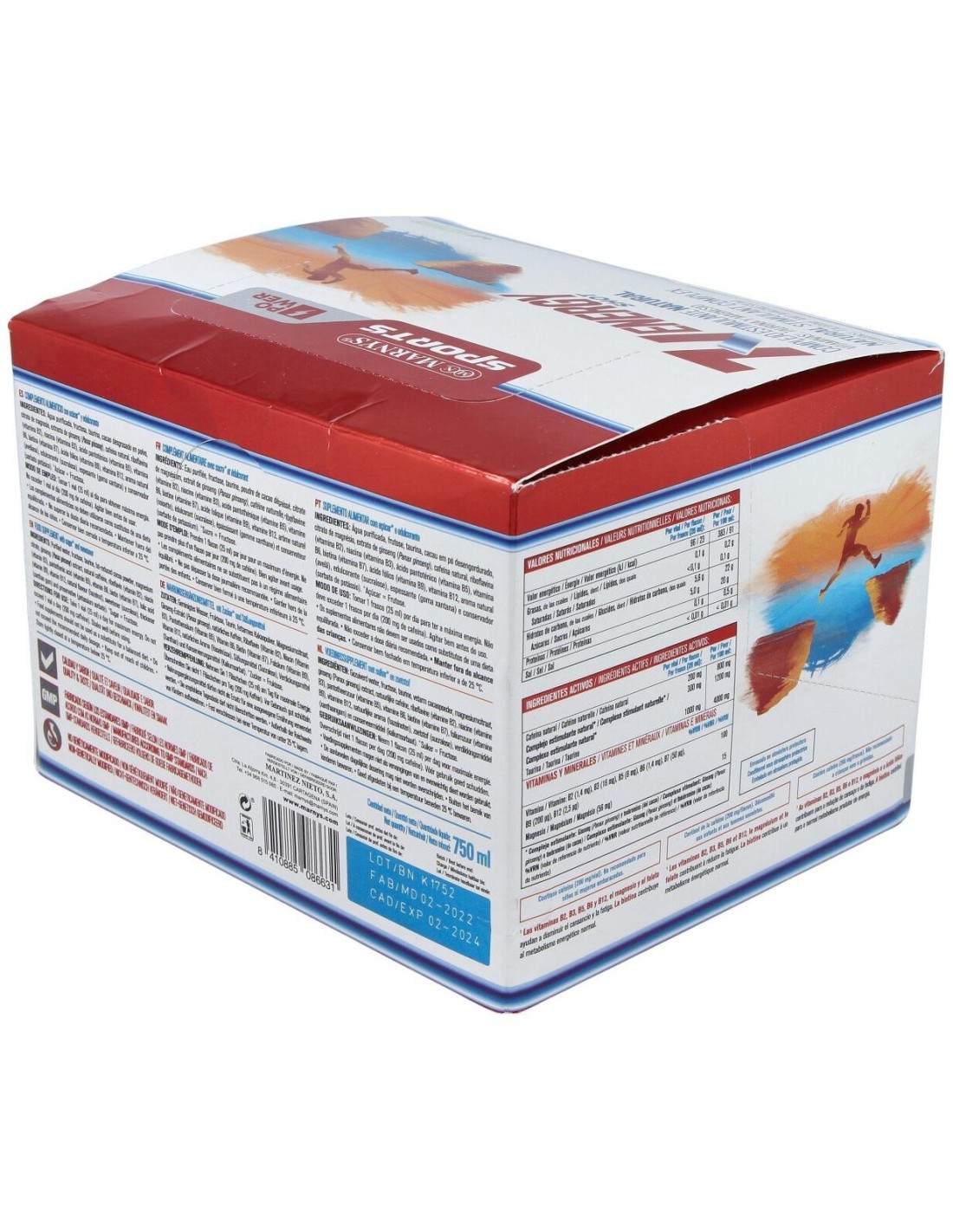 Agua purificada, fructosa, taurina, cacao desgrasado en polvo, citrato de magnesio, extracto de ginseng (Panax ginseng), cafeína natural, riboflavina (vitamina B2), niacina (vitamina B3), ácido pantoténico (vitamina B5), vitamina B6, biotina (vitamina B7), ácido fólico (vitamina B9), vitamina B12, aroma natural (avellana), edulcorante (sucralosa), espesante (goma xantana) y conservador (sorbato potásico).