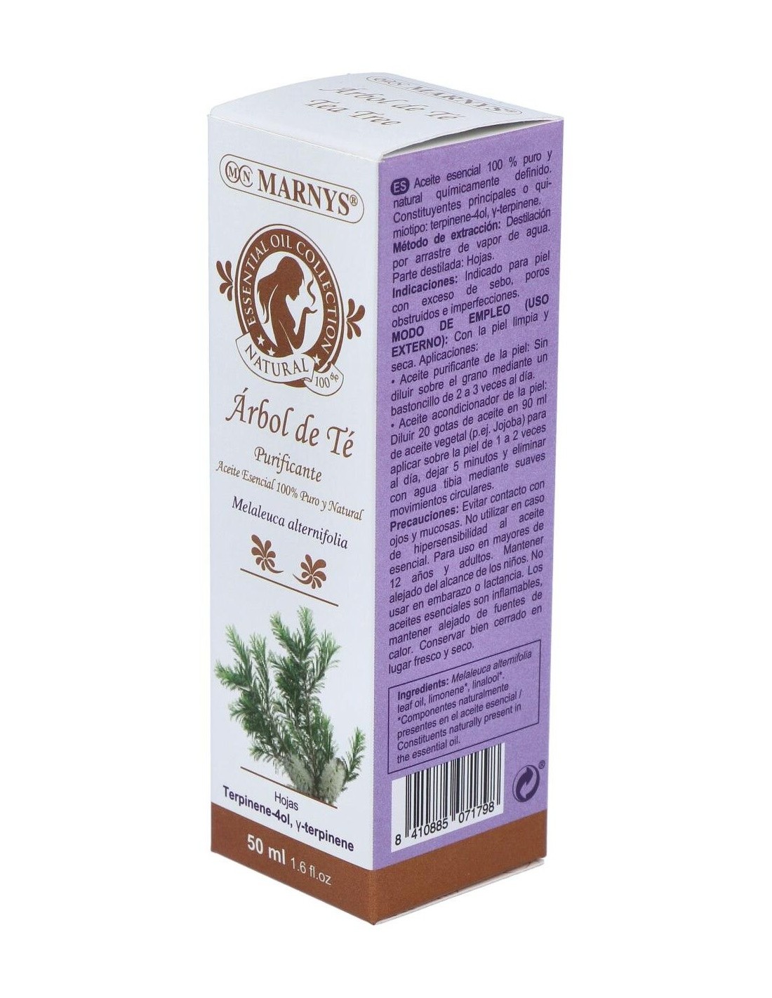 Marnys aceite esencial árbol del té es un aceite antiséptico y antibacteriano de amplio espectro. Gracias a sus principios activos se utiliza como remedio al acné y en heridas, quemaduras, verrugas, pie de atleta, combate el olor de pies, revitalizante, estimulante y tonificante.