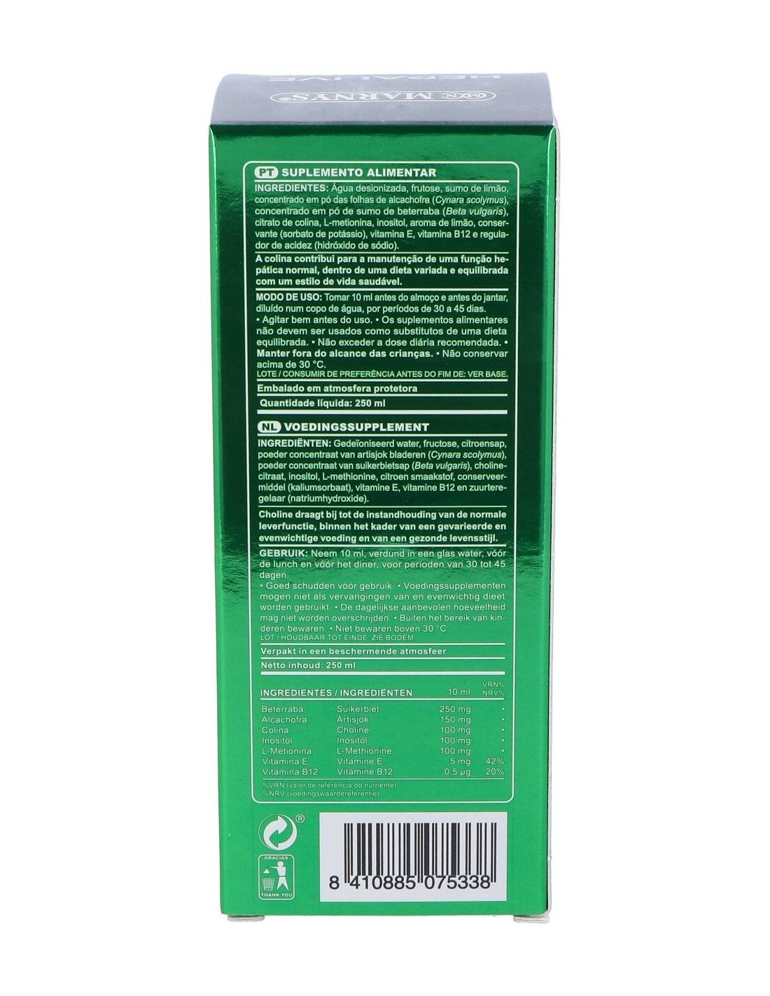 Formulado con extracto de alcachofa y remolacha, zumo de limón, aminoácido metionina, vitamina E y vitamina B12. Cuenta con propiedades détox, ya que ayudan al mantenimiento del funcionamiento hepático de forma adecuada. La alcachofa además de beneficiar la función hepática, también ayuda al aparato gastrointestinal. Su contenido de vitamina E ayuda en la protección celular del daño oxidativo y la remolacha ideal para una dieta saludable.