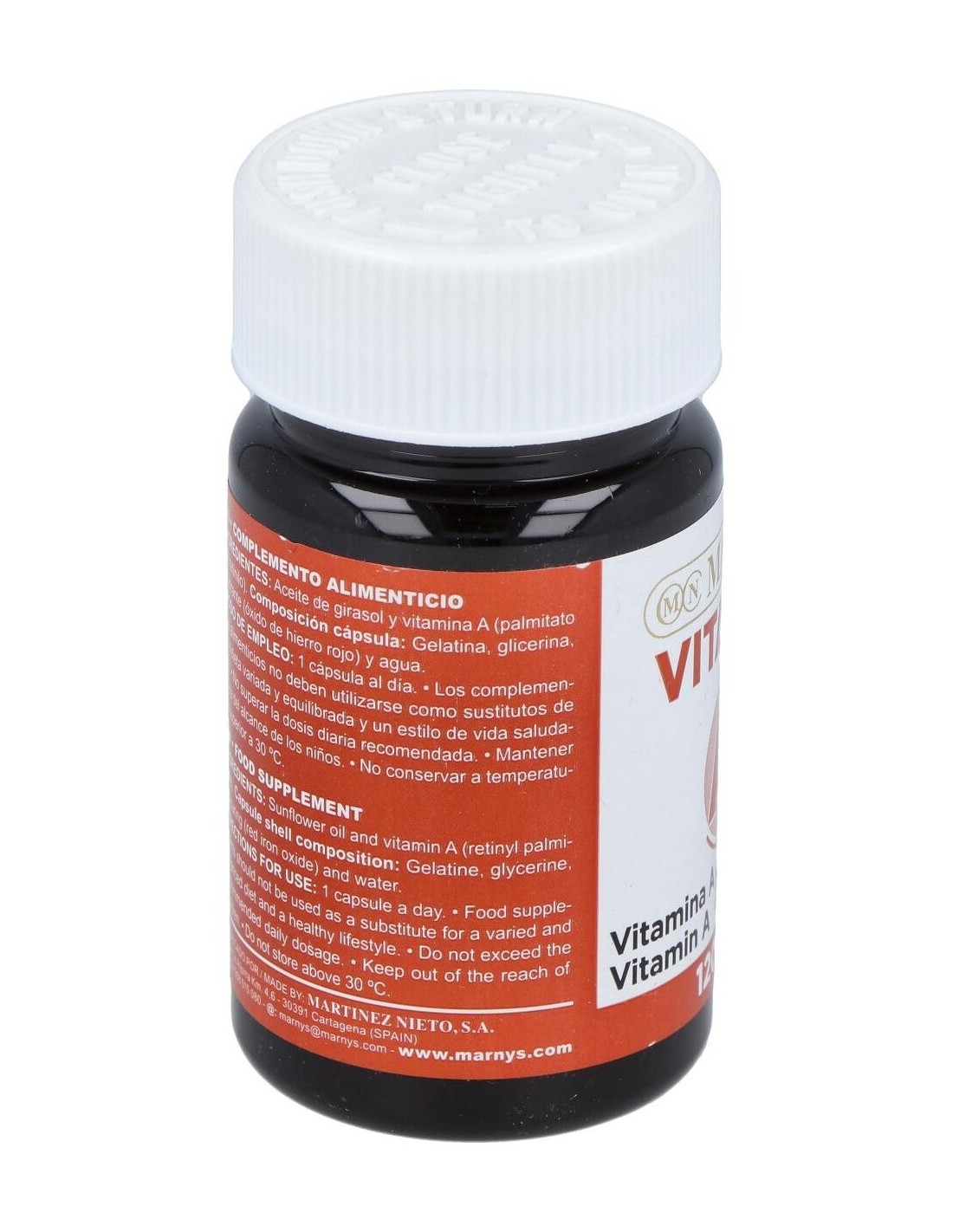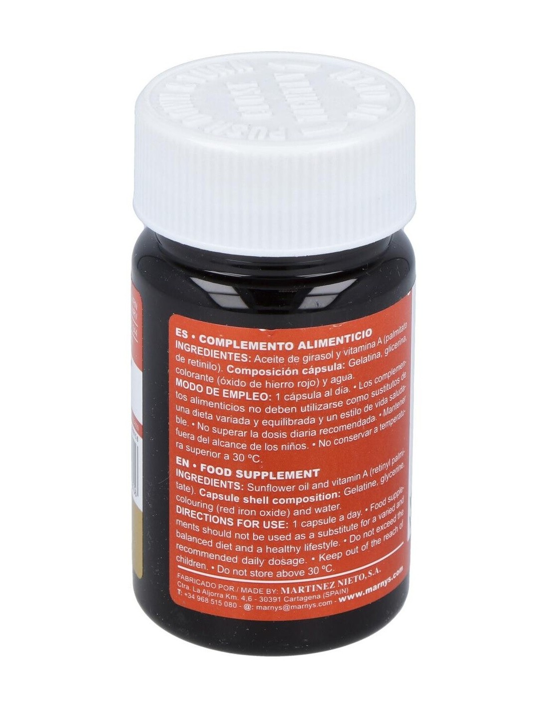 Aceite de girasol y vitamina A (palmitato de retinilo). Composición cápsula: Gelatina, glicerina, colorante (óxido de hierro rojo) y agua.