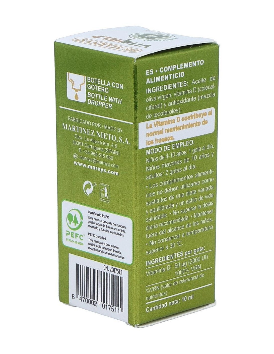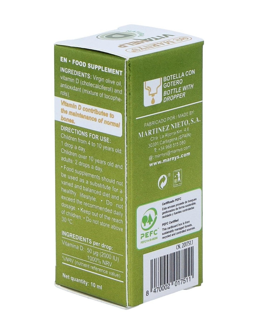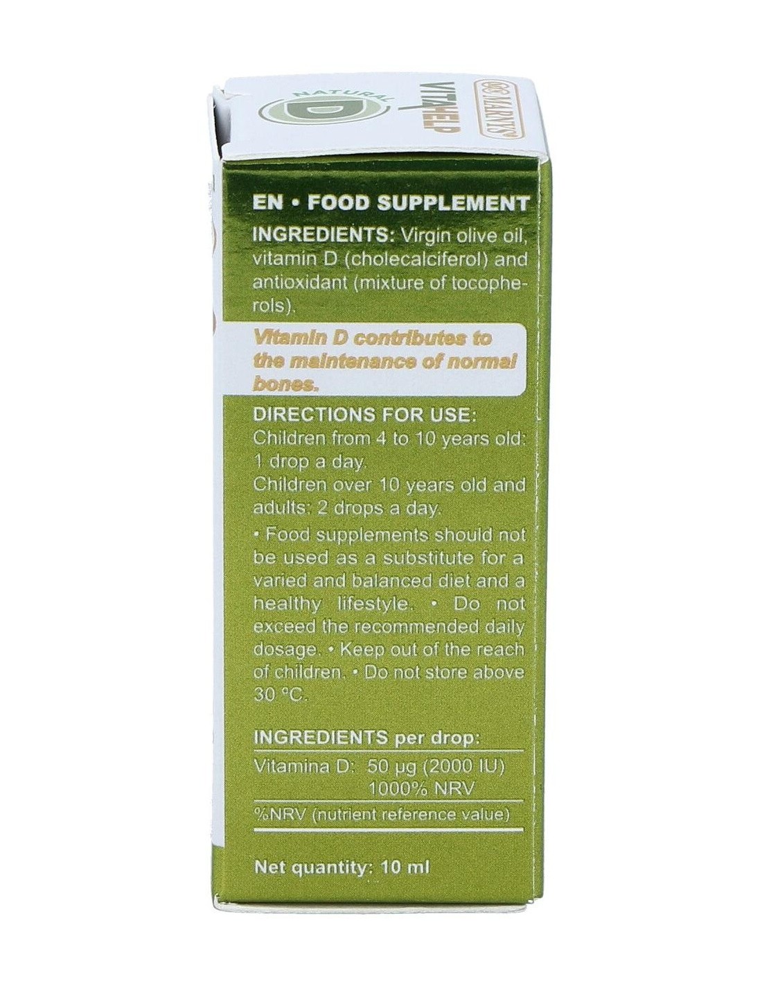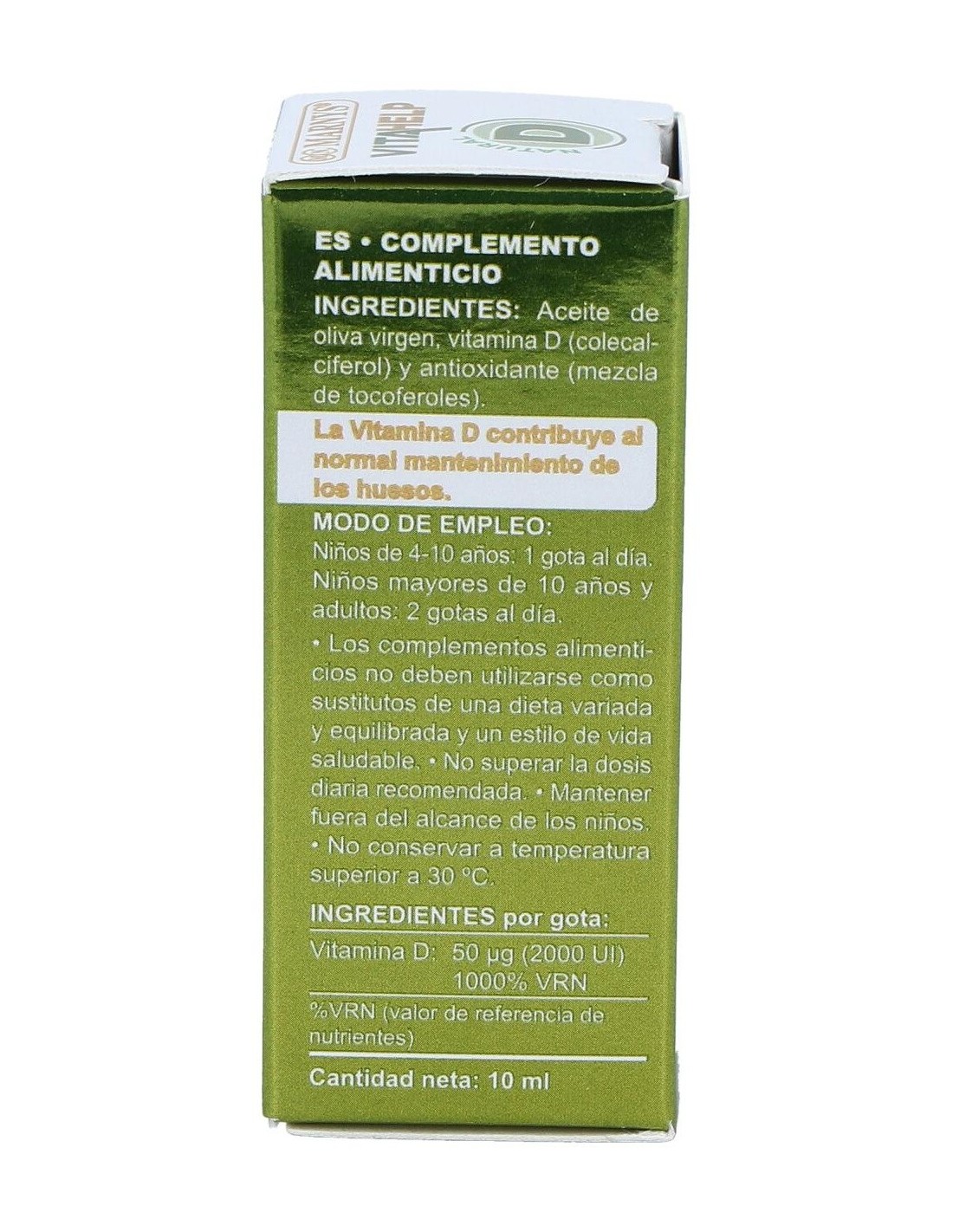 Complemento alimenticio con base de aceite de oliva y un contenido de 2000 UI de vitamina D en su forma D3 (colecalciferol). Presentación en formato líquido. Favorece el normal funcionamiento del sistema inmune, la correcta absorción del calcio y un adecuado desarrollo óseo en los niños. Indicada para adultos y niños.