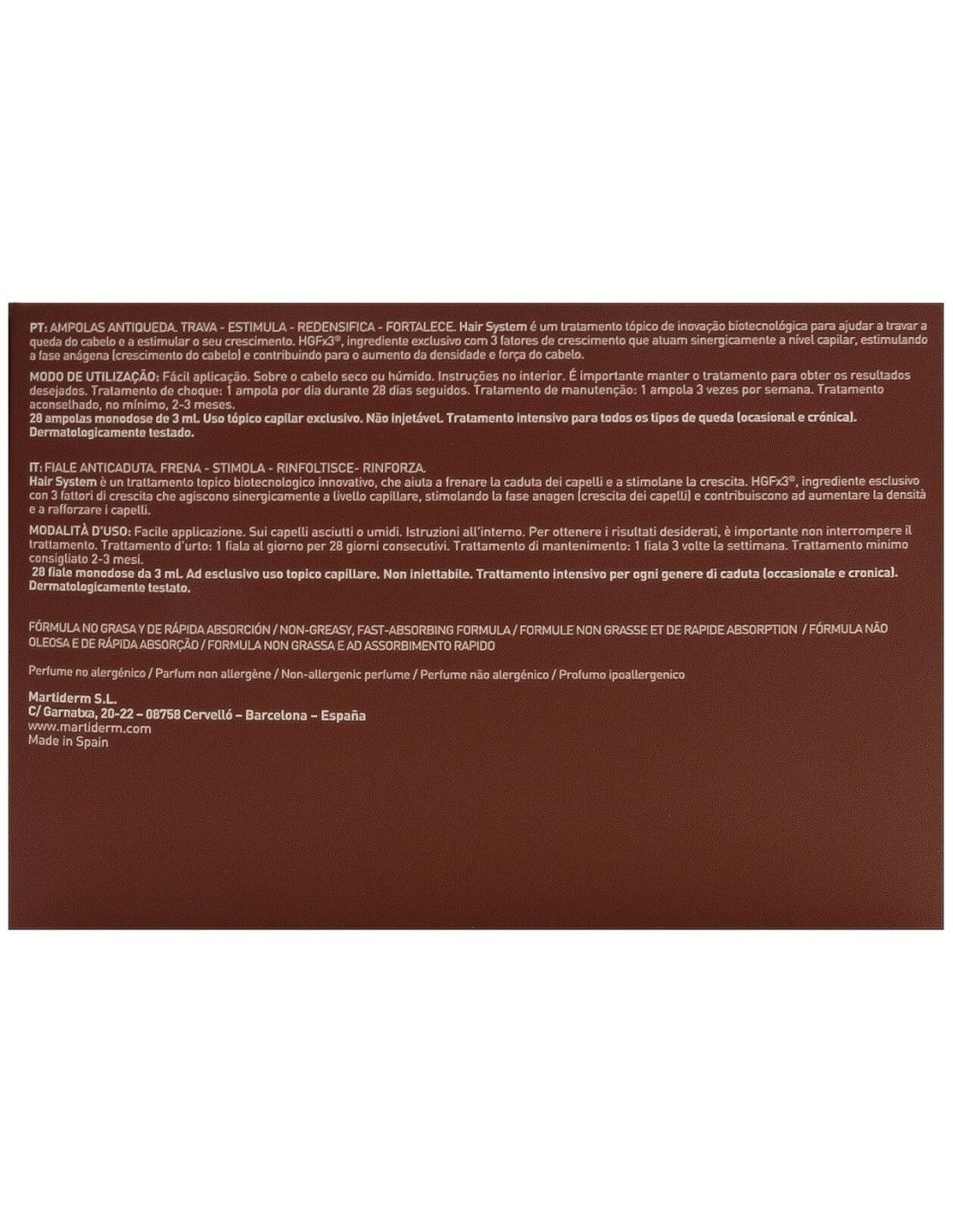 MARTIDERM | Martiderm ampollas anticaída hair system 3GF 28ampMartiderm ampollas anticaída hair system 3GF es un tratamiento anticaída que frena, estimula, redensifica y fortalece el cabello. Gracias a su formulación con factores de crecimiento ayuda a frenar la caída y estimular el crecimiento del cabello.