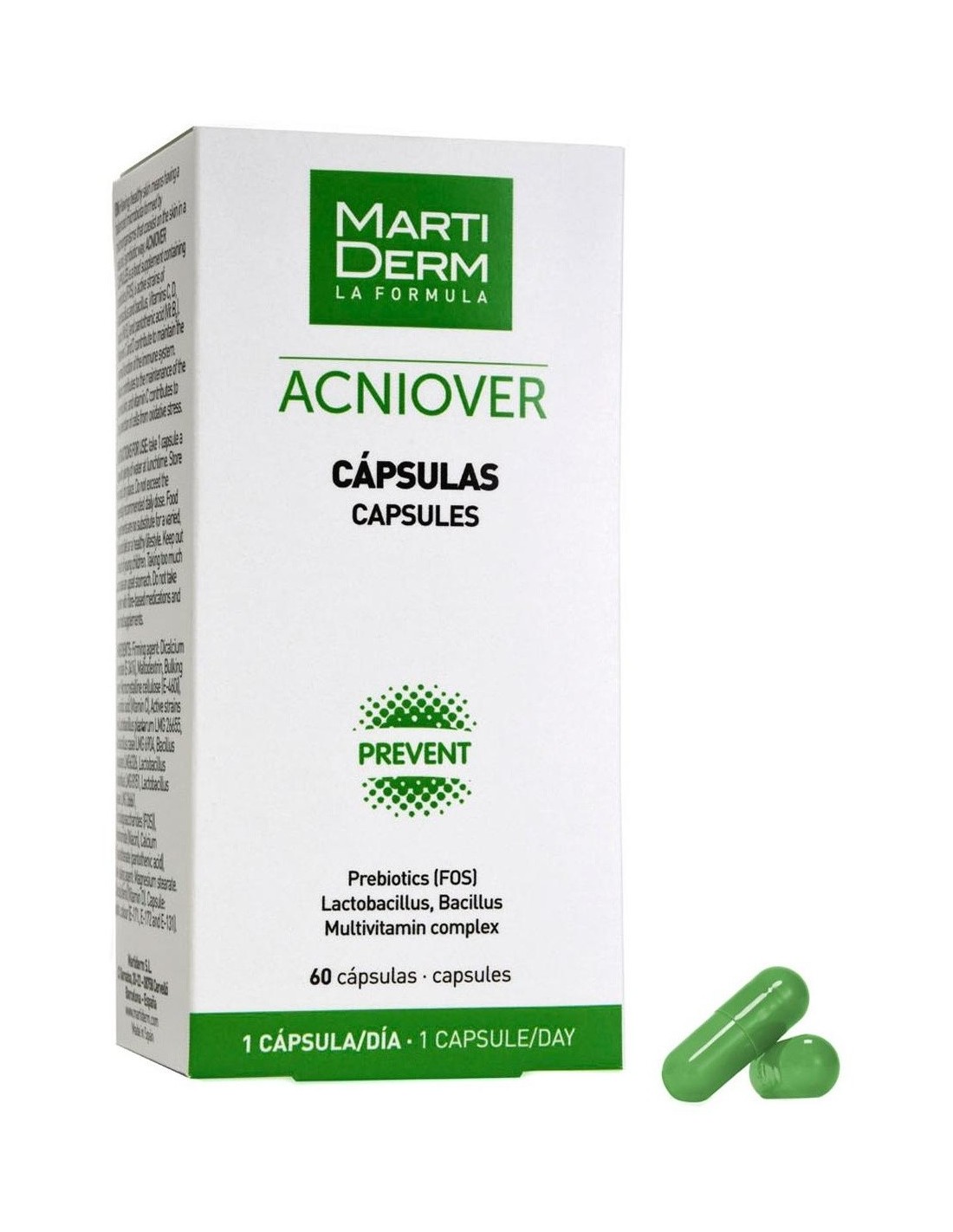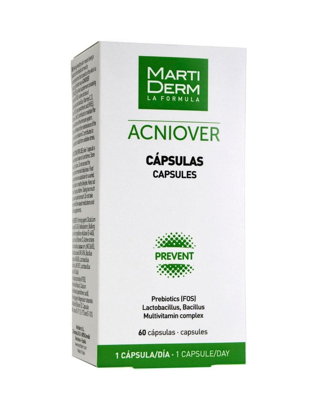 Martiderm Acniover 60caps es un complemento alimenticio para personas con piel grasa y tendencia acneica suave o moderada. Se trata de un complejo multivitamínico con prebióticos, probióticos, lactobacilus y niacinamida que contribuye a lograr una piel sana.