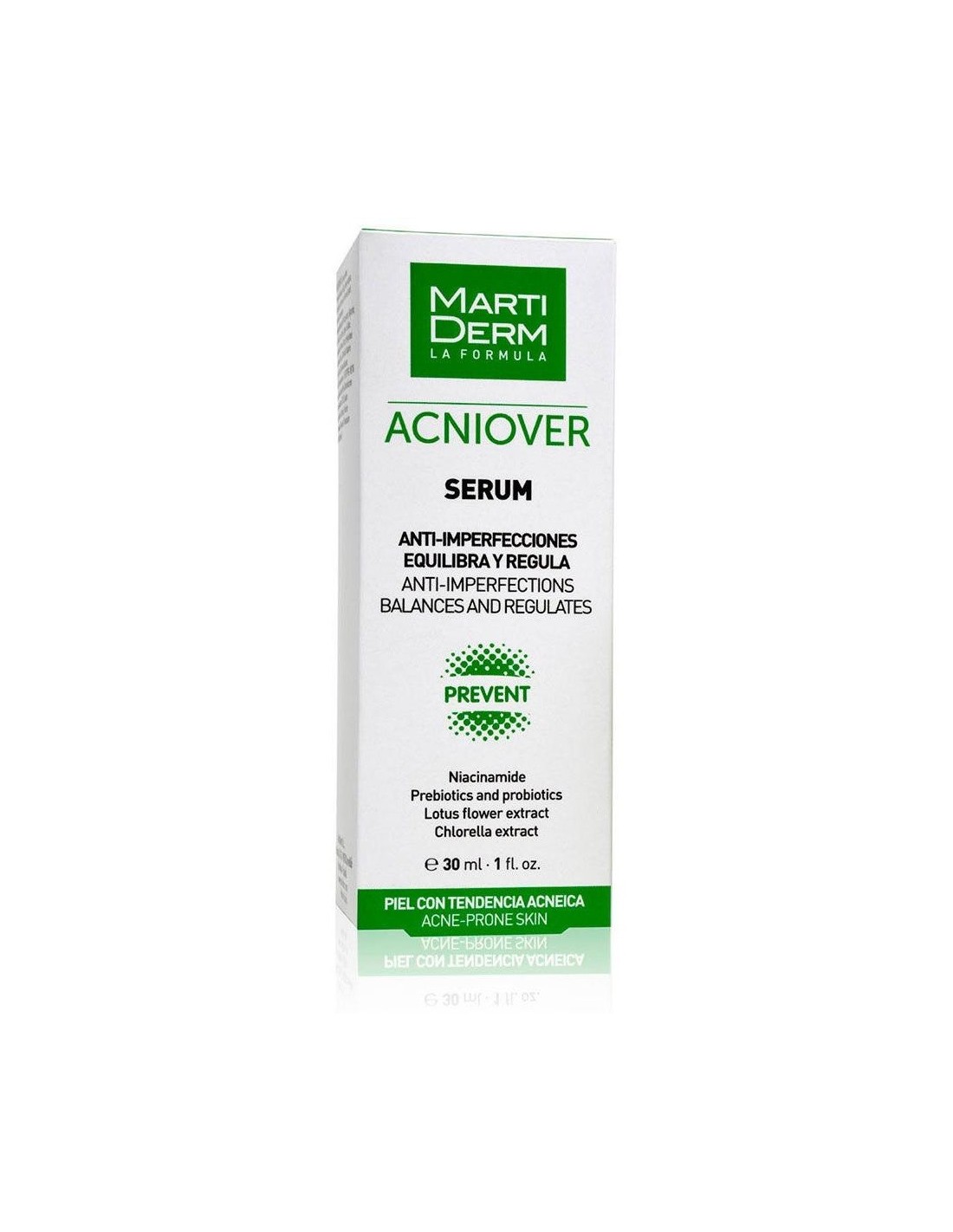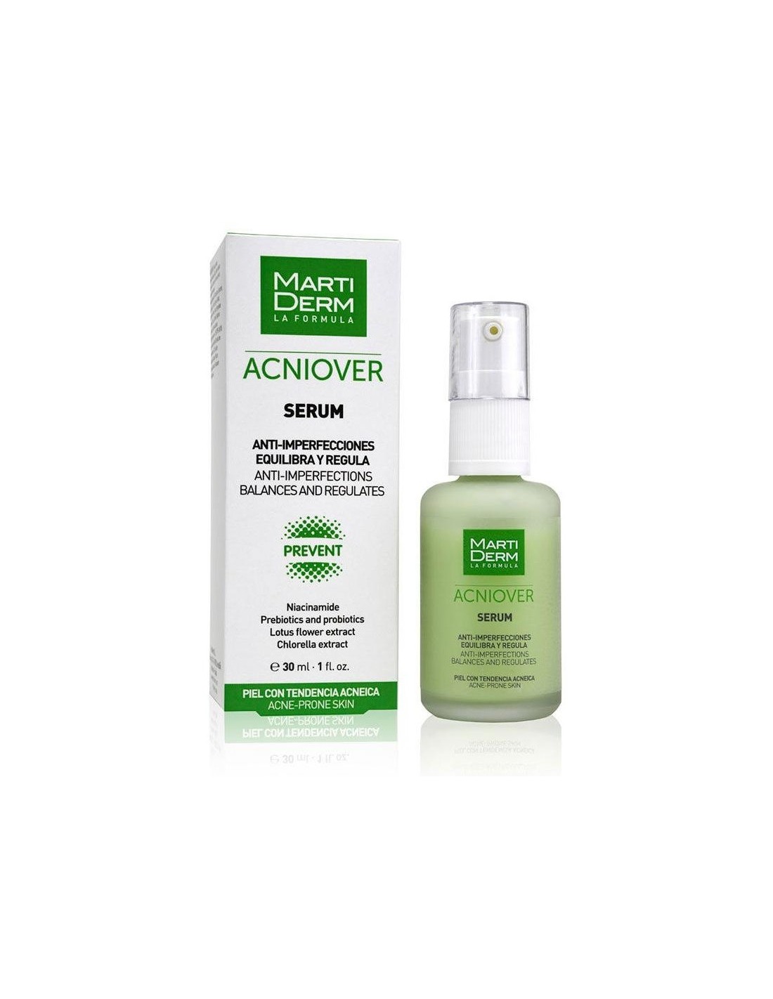 Martiderm Acniover Sérum 30ml es un sérum que ayuda a prevenir y tratar el acné. Formulado con extracto de la flor de loto, niacinamida, probióticos y prebióticos. Ayuda a regular el exceso de sebo, reduce las imperfecciones y equilibra el pH natural de la piel. La textura de sérum permite la rápida absorción de los activos en concentraciones eficaces, reduciendo la cantidad de sebo, el enrojecimiento y previniendo la aparición de espinillas.