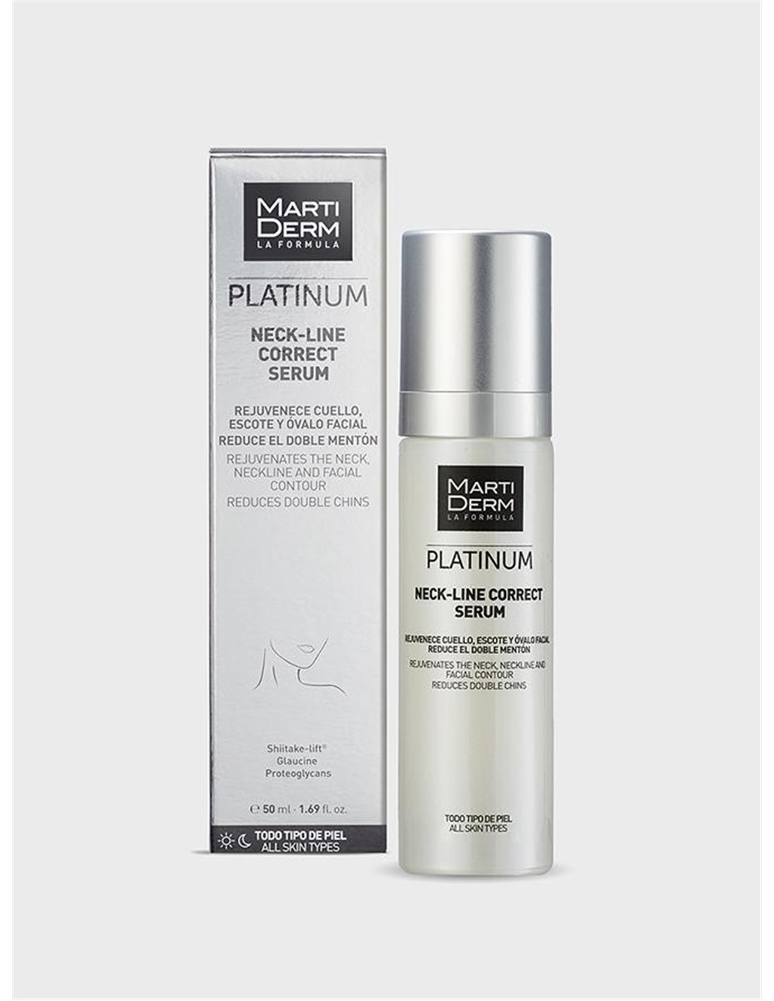 MARTIDERMHa sido especialmente creado para el cuidado de una zona muchas veces olvidada: cuello, escote y óvalo facial. Gracias a su combinación de ingredientes innovadores consigue mejorar drásticamente esta zona, reduciendo las arrugas y reafirmando cuello y escote. Además, hidrata en profundidad y ayuda a reducir el doble mentón, recuperando el aspecto de una piel más joven.