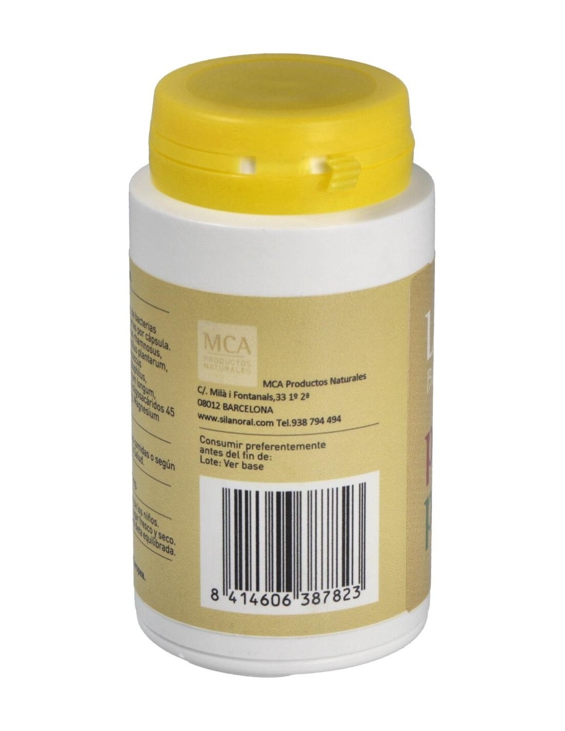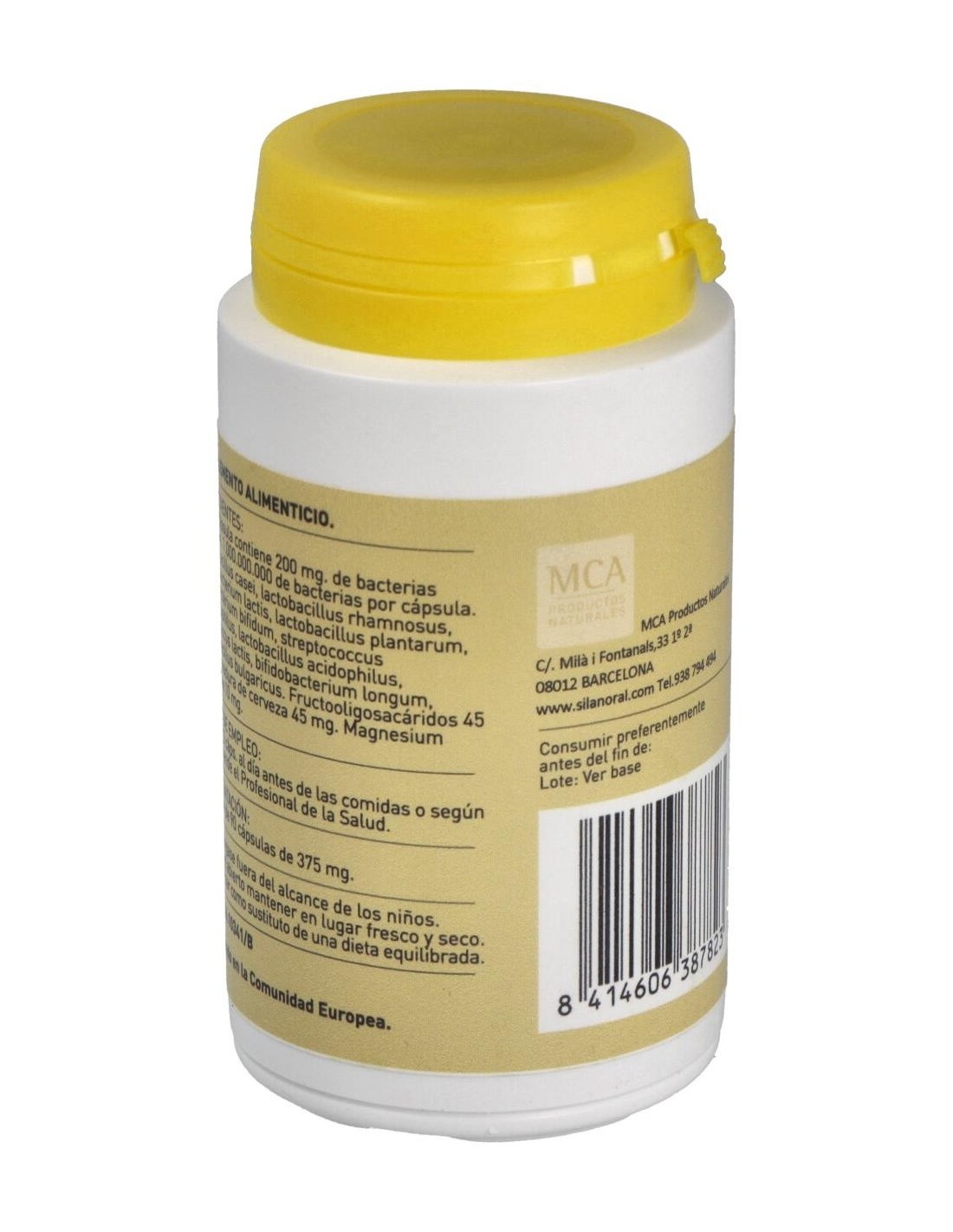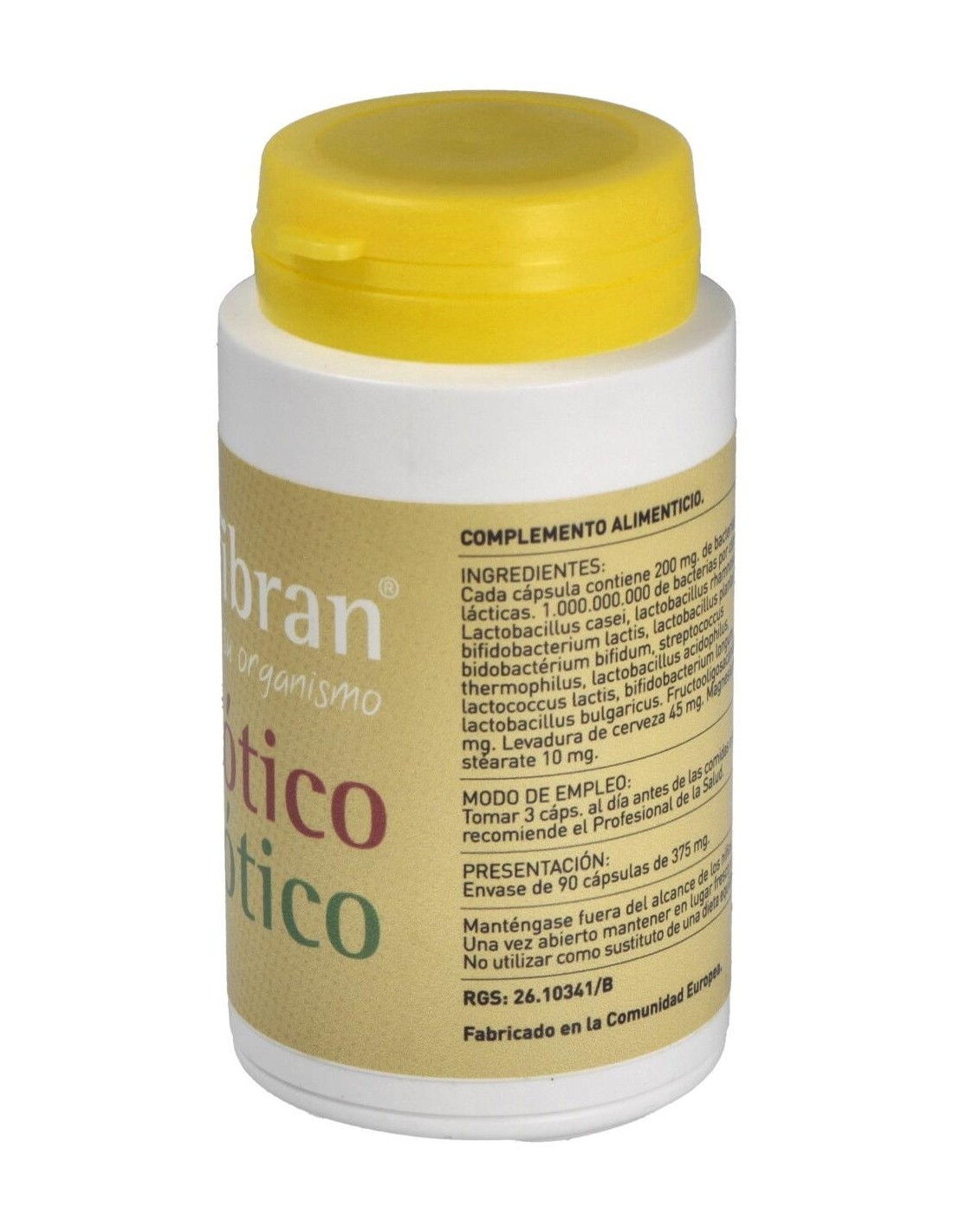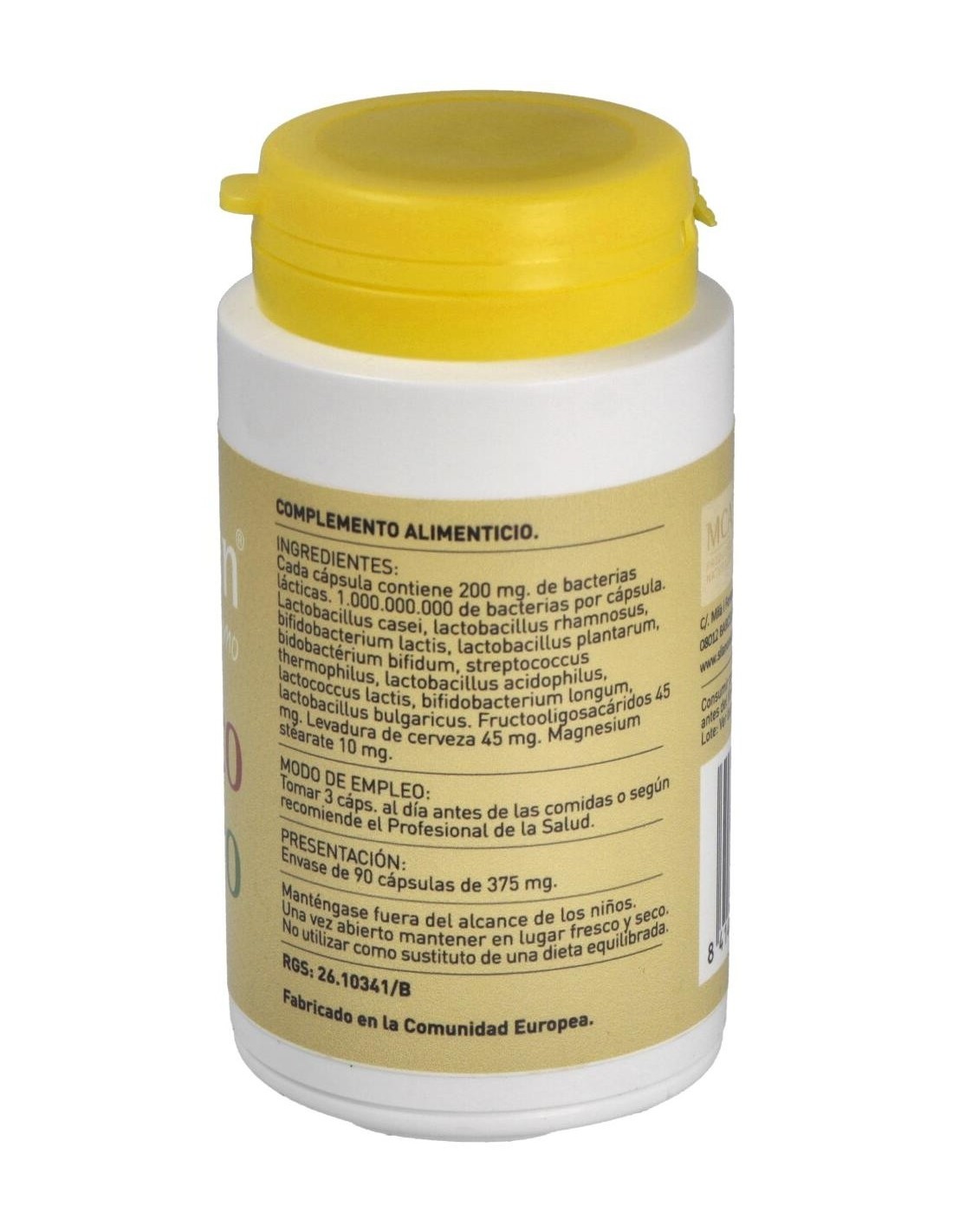 200 mg. de bacterias lácticas, 1.000.000.000 de bacterias por cápsula, Lactobacillus casei, Lactobacillus rhamnosus, bifidobacterium lactis, lactobacillus plantarum, bidobactérium bifidum, streptococcus thermophilus, lactobacillus acidophilus, lactococcus lactis, bifidobacterium longum, lactobacillus bulgaricus, Fructooligosacáridos, Levadura de cerveza, Magnesium stearate.