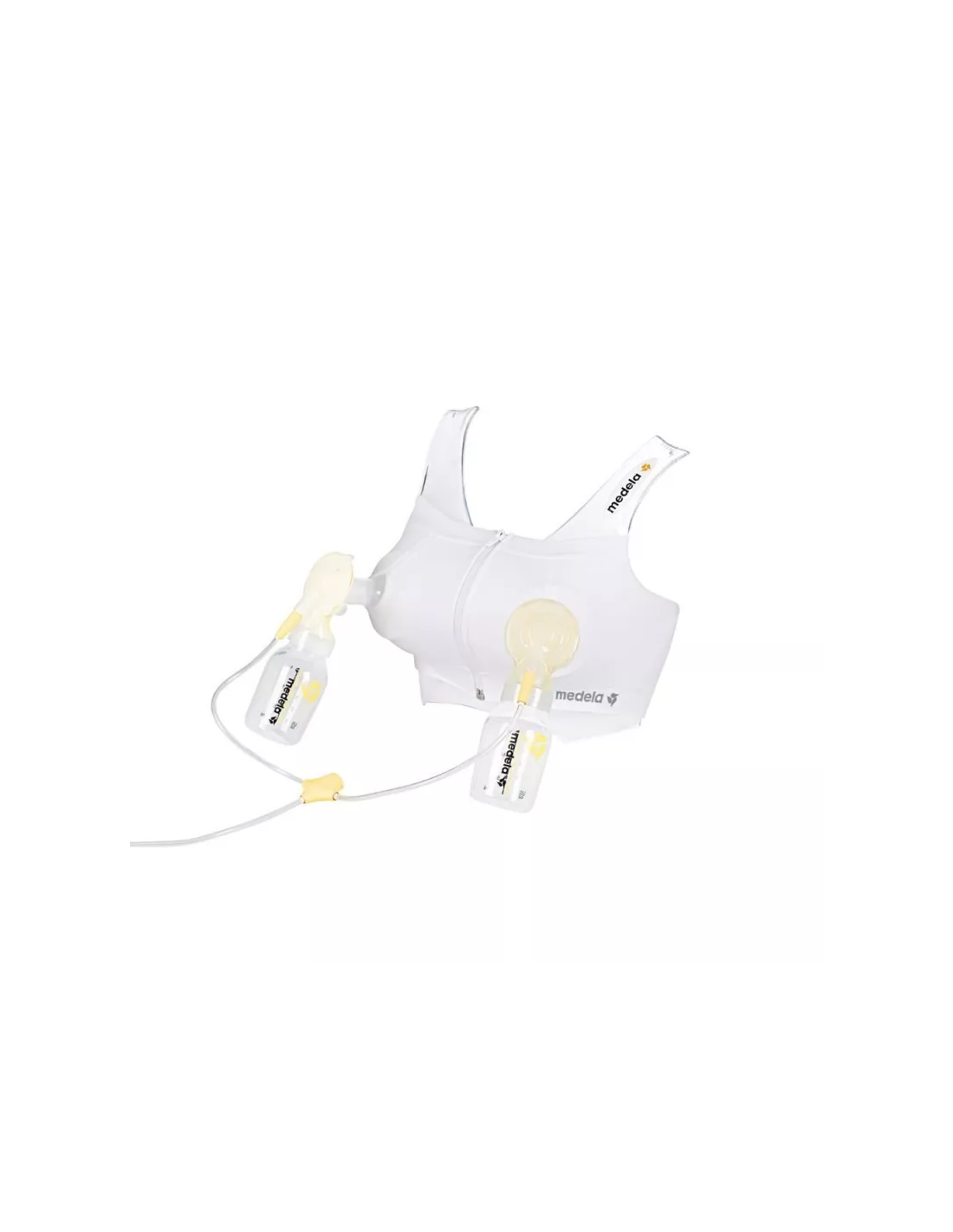 El top de extracción Hands-free de Medela hace que la extracción de leche sea fácil y práctica. Tanto el extractor de leche como embudos quedan bien sujetados.